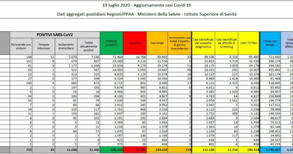 Al 19 luglio, il totale delle persone che hanno contratto il coronavirus che causa il Covid-19 e' di 244.434, con un incremento rispetto al 18 luglio di 219 nuovi casi. Lo rende noto il ministero della Salute. Il numero totale di attualmente positivi e' di 12.440, con un incremento di 72 assistiti rispetto al 18 luglio. Tra gli attualmente positivi, sono 49 (-1) in cura presso le terapie intensive. Mentre 743 persone sono ricoverate con sintomi, con un decremento di 14 pazienti rispetto al 18 luglio. Invece, 11.648 persone sono in isolamento senza sintomi o con sintomi lievi. Rispetto al giorno precedente i nuovi deceduti sono 3 e portano il totale a 35.045. Il numero complessivo dei dimessi e guariti sale invece a 196.949, con un incremento di 143 persone rispetto al 18 luglio. Il numero di tamponi effettuati nelle ultime ventiquattro ore ammonta a 35.525, per un totale di 6.238.049. Si tratta del numero più basso di vittime da febbraio.