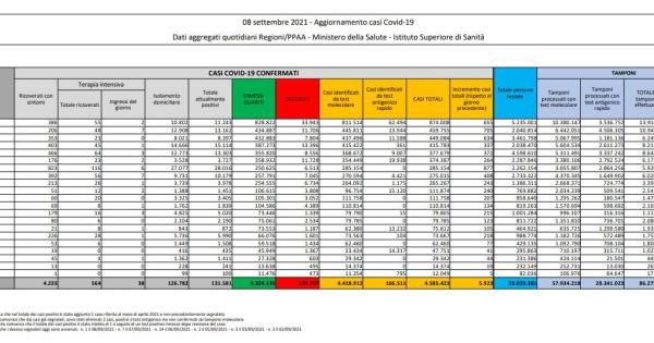 ROMA (ITALPRESS) - Ancora un nuovo balzo dei casi Covid in Italia. Dai dati forniti dal ministero della Salute e contenuti nel consueto bollettino si evince che i nuovi positivi sono 5.923, in crescita rispetto ai 4.720 registrati il 7 settembre. Ciò a dispetto di un numero inferiore di tamponi effettuati, 301.980 e che incrementa di poco il tasso di positività all'1,97%. Lieve flessione dei decessi, 69 (-2). I guariti sono 8.058, gli attualmente positivi decrescono di 2.206 unità attestandosi su un totale di 131.581. Scendono i ricoveri nei reparti ordinari (-72) con un numero complessivo pari a 4.235; quasi stabili le terapie intensive a 564 (+1), e 38 nuovi ingressi. In isolamento domiciliare vi sono 126.782 persone. Sicilia ancora prima per numero di contagi (875), seguita da Veneto (705) e Lombardia (655). (ITALPRESS). tai/sat/red 08-Set-21 17:33