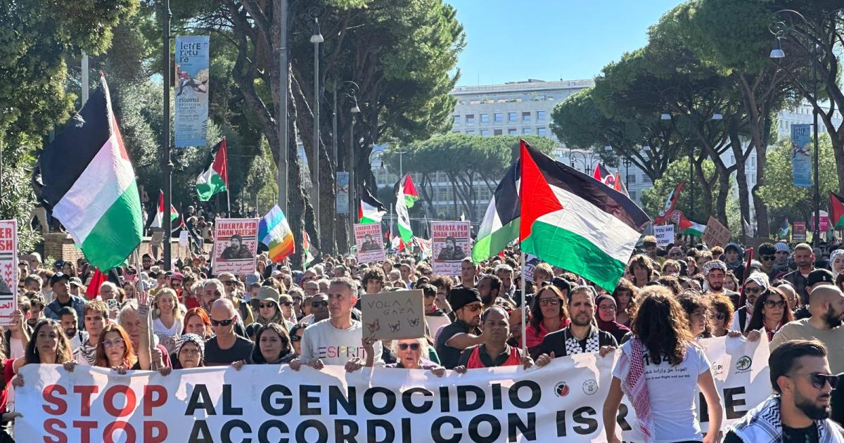 ROMA (ITALPRESS) - Migliaia di persone si sono ritrovate a Roma, a Porta San Paolo, davanti alla fermata della metropolitana Piramide, per partecipare alla manifestazione promossa dal Movimento degli studenti palestinesi. All'iniziativa, in sostegno della Global Sumud Flotilla, hanno aderito numerose realtà associative e sindacali, tra cui Usb, Cgil, Anpi, Arci, oltre a diversi collettivi universitari e studenteschi. Il corteo è partito alle 14:30 da Porta San Paolo e si dirigerà verso piazza San Giovanni, attraversando le vie del centro. Tra i partecipanti anche i collettivi Osa, Cambiare Rotta e Zaum. - foto xc7 Italpress - (ITALPRESS). xc7/vbo/red 04-Ott-25 15:20
