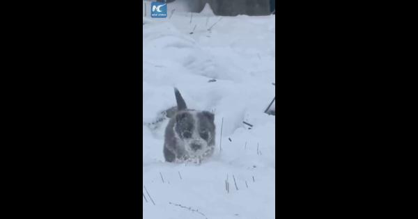 Cina, cucciolo di cane da pastore sfida la neve per radunare le pecore
