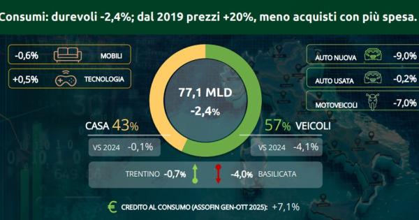 ROMA (ITALPRESS) - Dopo due anni di crescita il motore dei beni durevoli si ferma: a fine 2025 il comparto segnerà consumi in calo del 2,3% in volume e del 2,4% in valore, per una spesa complessiva che da 79 miliardi scivola a 77,1 miliardi. È la fotografia scattata dal 32° Osservatorio Findomestic, realizzato insieme a Prometeia, per un mercato che resta comunque su livelli più alti rispetto al pre-Covid, non per un aumento dei volumi acquistati ma esclusivamente per l'incremento dei prezzi che in 6 anni sfiora il 20%. A determinare il segno meno è soprattutto la mobilità, il segmento che da solo vale il 57% della spesa delle famiglie in beni durevoli. Qui la frenata è evidente, con le auto nuove in calo del 9% a valore. La casa - mobili e tecnologia - resta invece impantanata in una stagnazione che dura dal 2023, dopo gli exploit del triennio post-pandemico. Sul fronte territoriale, le tre locomotive storiche - Lombardia, Lazio e Veneto - perdono tra il 2,6 e il 2,8%. Resiste meglio l'Emilia-Romagna (-1,8%), che quasi aggancia il podio nella graduatoria per volumi di spesa. "Quest'anno i beni durevoli soffrono più degli altri comparti. Mentre servizi, alimentari e altri beni crescono - secondo i dati Istat - il nostro perimetro torna negativo dopo due anni di espansione, quella del 2023, trainata più dall'inflazione che dai volumi reali - afferma Claudio Bardazzi, responsabile dell'Osservatorio Findomestic -. Chiuderemo il 2025 con un -2,4% a valore, che si traduce in una reale riduzione della spesa delle famiglie'. Per Bardazzi 'siamo ancora su livelli di spesa superiori dell'11,4% al 2019, ma questo non significa che si compri di più. Il vero motore è stato l'aumento dei prezzi, vicino al +20%. Al netto dell'inflazione, cioè guardando ai volumi, i consumi di durevoli sono in realtà il 6,8% sotto i livelli pre-pandemia". In questo quadro di frenata il credito al consumo va in controtendenza, uno strumento che le famiglie stanno usando per reagire all'incertezza. Lo ribadisce Marco Tarantola, Amministratore Delegato e Direttore Generale di Findomestic Banca: "A fronte di consumi in calo nel mondo dei durevoli, il mercato del credito continua a crescere. Nei primi dieci mesi dell'anno le erogazioni segnano un +7%, con la rischiosità che rimane su livelli molto contenuti (1.7% il tasso di default a fine settembre 2025, pur mostrando un lieve incremento nel corso dell'anno. È la conferma che il credito al consumo svolge un ruolo sociale ed economico essenziale: aiuta le famiglie a non rinunciare ai propri progetti in un contesto che resta complesso". Il dato che più colpisce arriva dalle indagini condotte dall'istituto: "Oltre quattro italiani su dieci - ricorda Tarantola - hanno utilizzato una forma di credito almeno una volta negli ultimi tre anni. E più del 60% di chi lo ha fatto dichiara che, senza questa possibilità, avrebbe dovuto rinviare o rinunciare del tutto all'acquisto. Dati che confermano come il credito oggi sia una leva di fiducia, non solo un prodotto finanziario". Se l'Italia rallenta, ogni territorio lo fa con il suo stile. Ci sono regioni che assorbono meglio la scossa. In Trentino-Alto Adige, dove i redditi restano elevati e il clima economico è meno nervoso, il calo è solo -0,7%, il migliore d'Italia. Più sorprendente la tenuta della Sicilia e della Liguria, entrambe ferme a -1,3%: due territori lontani geograficamente ma accomunati da una domanda interna che resiste. All'opposto, in Basilicata il mercato dei durevoli cede il 4%: una flessione che non è solo statistica ma strutturale, fatta di consumi fragili e poca spinta demografica. Il rallentamento è stato consistente anche in Piemonte (-3,5%), Molise (-3,3%), Abruzzo e Lazio (entrambe -2,8%). Sul piano dei valori assoluti, la Lombardia continua a giocare un altro campionato: 15,4 miliardi, più del doppio del Lazio, che segue a 7,5. È la locomotiva che tira il Paese, anche quando il convoglio frena. Nel 2025 il mercato italiano della mobilità vive una doppia velocità: l'usato tiene la linea, il nuovo rallenta, le due ruote correggono la corsa dopo anni di sprint. Dal 2017 quello delle auto usate è il primo mercato per valore assoluto e continua a dimostrarlo. L'effetto inflazione è evidente: si spende il 25% in più rispetto al 2019 per acquistare appena il 3% di vetture in più. Nel 2025, dopo due anni di crescita, il settore rallenta e il suo giro d'affari chiuderà con un -0,2%, sostanzialmente in stallo, con l'incremento dei passaggi di proprietà (+2,1%) annullato dal calo dei prezzi (-2,1%). Ma i valori restano solidi: 24,4 miliardi di euro, quasi 8 miliardi in più dell'auto nuova, complice una domanda, negli ultimi anni, sempre più orientata al risparmio. Prezzi in calo e mix di vendita più 'popolare' confermano che il consumatore è cauto ma attivo. Per le auto nuove la frenata è netta: -9% a valore, con la spesa delle famiglie che scende a 16,5 miliardi. Le immatricolazioni calano (-9,9%), i prezzi restano stabili (+0,8%) dopo anni di forte crescita e il mix si sposta su fasce e tecnologie più costose. Le city car, un tempo spina dorsale del mercato, passano dal 17% del 2019 al 12%. La domanda dei privati resta lontana dai livelli pre-pandemia: -25% le immatricolazioni rispetto al 2019, -10% la spesa. Non bastano incentivi a singhiozzo per stimolare le famiglie, alle prese con un potere d'acquisto ridotto rispetto a qualche anno fa e con un contesto di persistente incertezza. Dopo quattro anni di crescita, arriva uno stop per le moto: -7,7% a volume nel 2025, -7,0% a valore. Ma il confronto con il 2019 resta impressionante: +36% a volume, +55% a valore, per un mercato che vale 2,75 miliardi e che ha beneficiato in questi anni di una domanda, che in un contesto di inflazione e calo del potere d'acquisto, ha visto nei mezzi a due ruote un'alternativa low cost alla seconda o terza auto in famiglia. La flessione del 2025 sottende dinamiche differenziate tra ciclomotori, in fo