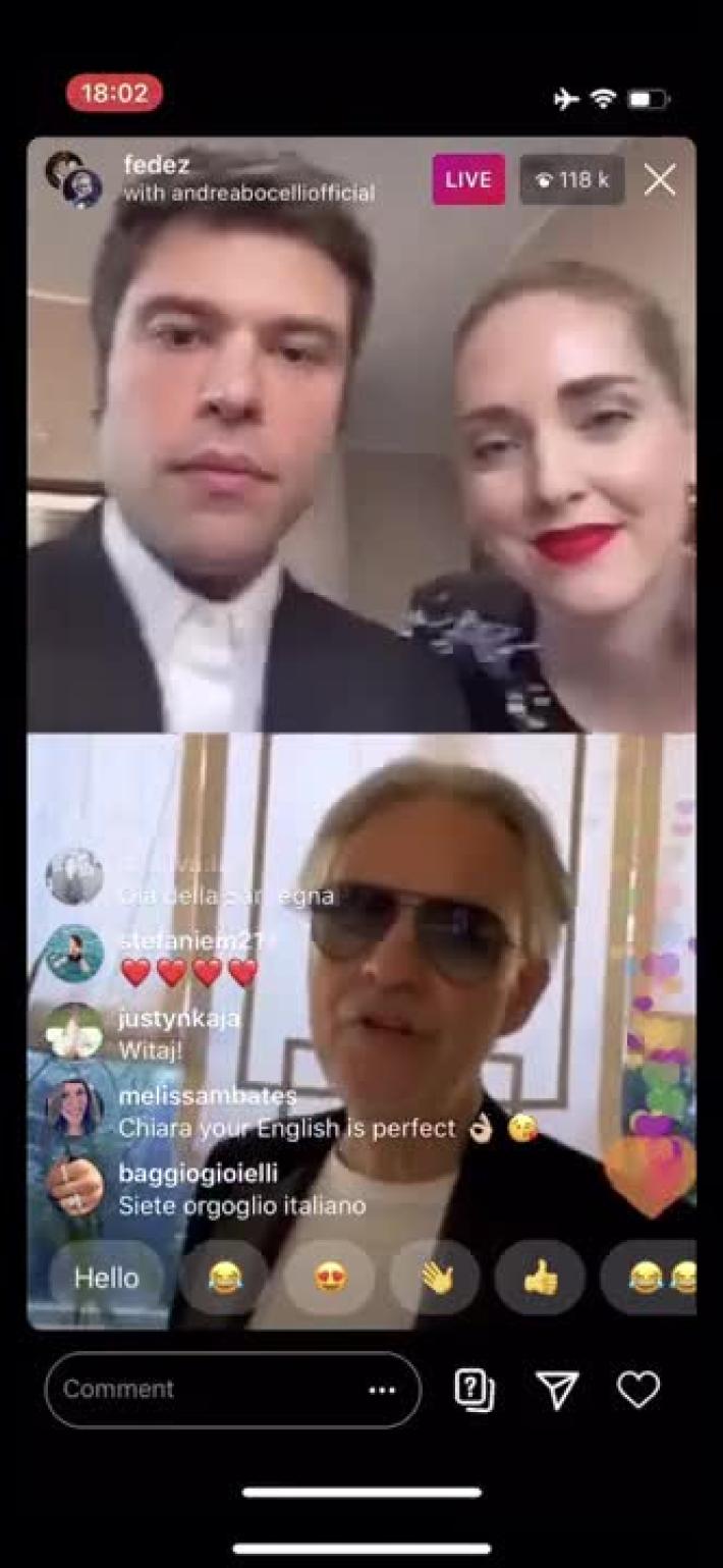 Fedez e Chiara Ferragni hanno raccolto l'appello che il Maestro Andrea Bocelli e la Fondazione con il suo nome hanno lanciato per sostenere una raccolta fondi dedicata all’emergenza Covid-19 e destinata all'ospedale di Camerino. Andrea e Matteo Bocelli si sono esibiti dal balcone "virtuale" di Citylife a Milano in diretta social tramite Instagram. E sono stati oltre 170mila gli utenti live (in crescita grazie alle successive condivisioni) ad aver assistito alle speciale performance. Ecco il video di Perfect Symphony. [Video Cr. Ufficio Stampa MN]