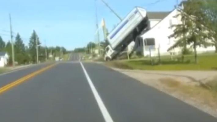 Mentre tornava a casa dal lavoro, questo guidatore è stato testimone di un incidente alquanto curioso: un camion rimbalza in un fosso, esce di strada e, in qualche modo, finisce con la parte posteriore sul tetto di un’abitazione. Per fortuna non ci sono stati feriti. L’incidente (spettacolare) è stato catturato dalla dashcam nei pressi di Alban, una cittadina canadese nell’Ontario. Secondo i media locali, il giovane alla guida, un ventiquattrenne di Toronto, è stato incriminato per negligenza alla guida (YouTube/Vh)