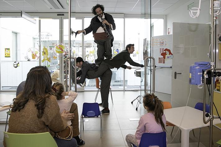 E così questa mattina gli artisti del Teatro Necessario, felici inventori di iniziative come “Tutti matti zottozero” e “Tutti matti per Colorno”, hanno portato fantasia e sorrisi ai pazienti ricoverati in pediatria con uno spettacolo pensato proprio per loro anche se le invenzioni fantastiche e i giochi musicali eseguiti con abile maestria da Alessandro Mori, Jacopo Bianchini e Leonardo Adorni hanno coinvolto tutti, grandi e piccini. Ad accoglierli le educatrici di Giocamico che, sotto le indicazioni attente del personale in servizio, hanno invitato a prendere posto nella saletta biblioteca un pubblico inedito anche per gli artisti che si sono esibiti.