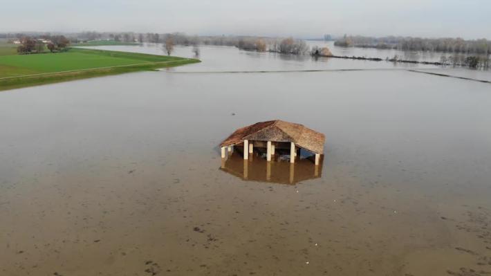 Un casale sommerso dall'acqua, il Po in piena fa paura. Ecco le immagini suggestive del Grande Fiume a Gramignazzo e Torricella riprese dal drone di Difly Video Lab.