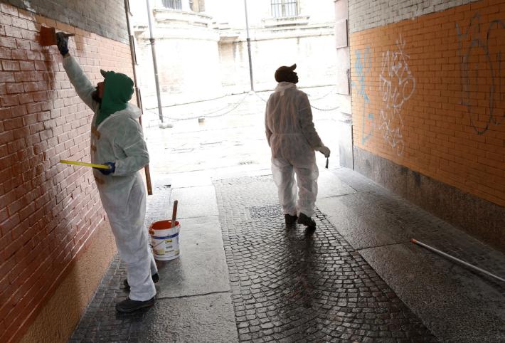 Questa mattina una squadra di addetti ha provveduto a ripitturare le pareti di vicolo Sant'Alessandro (di fronte alla Steccata) che erano state imbrattate dai graffiti.