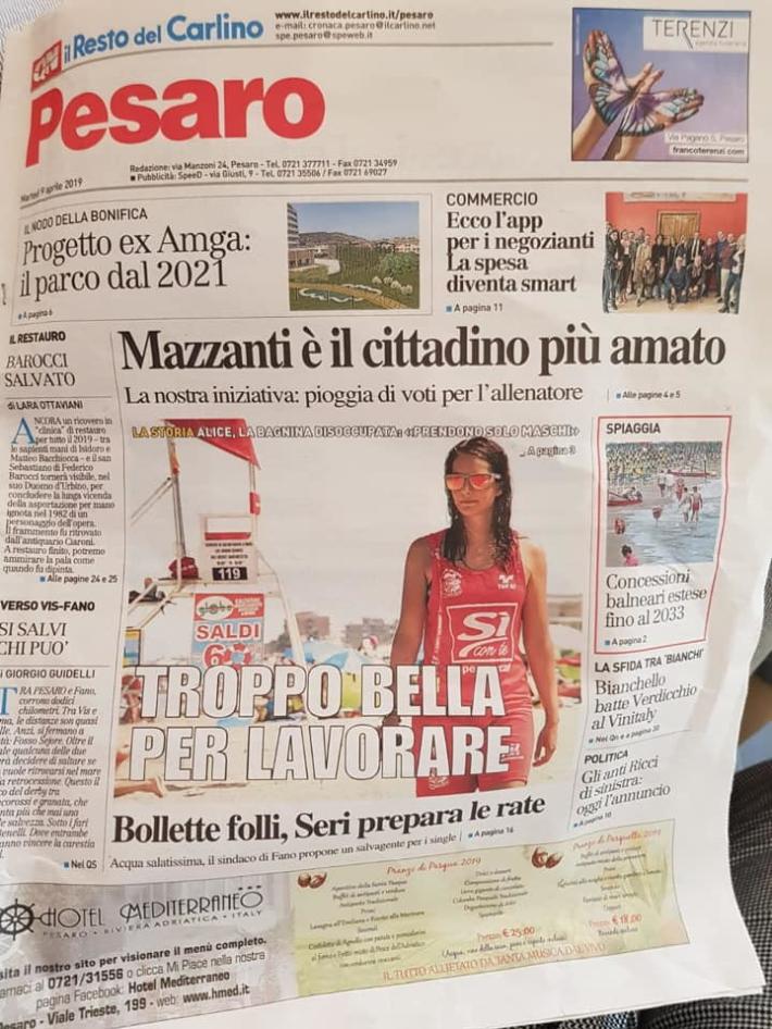 Nella prossima stagione estiva avrebbe voluto fare la bagnina a Pesaro e Fano. «Come fa una ragazza ad andare a salvare un uomo grosso che affoga in mezzo al mare?». «Una ragazza, anche carina, distrarrebbe i bagnanti e li farebbe affogare tutti», si è sentita rispondere Alice Soldi, 26 anni, dai titolari di stabilimenti balneari, ristoranti e alberghi con piscina della zona.