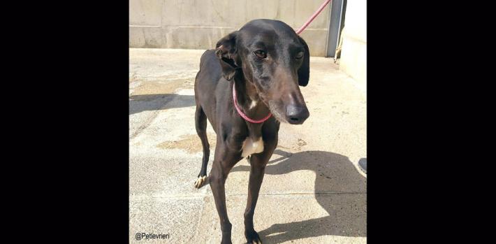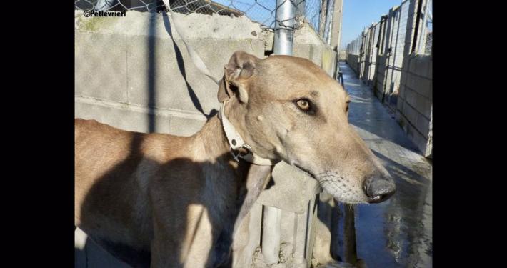 Adorabile femmina di Galgo di 2 anni. Nonostante il suoi trascorsi è affettuosa con le persone. In Italia il 15 maggio.
