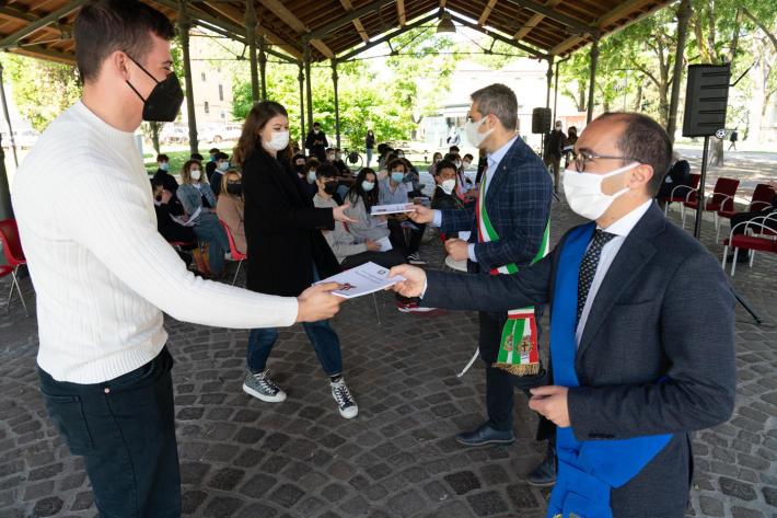 "Vi consegnamo questo piccolo grande dono" ha detto il Sindaco Federico Pizzarotti "con l'auspicio che vi possiate, durante il vostro cammino di uomini e donne, cittadini e cittadine, trovare delle risposte. Risposte che forse non troverete nella politica dei nostri giorni".