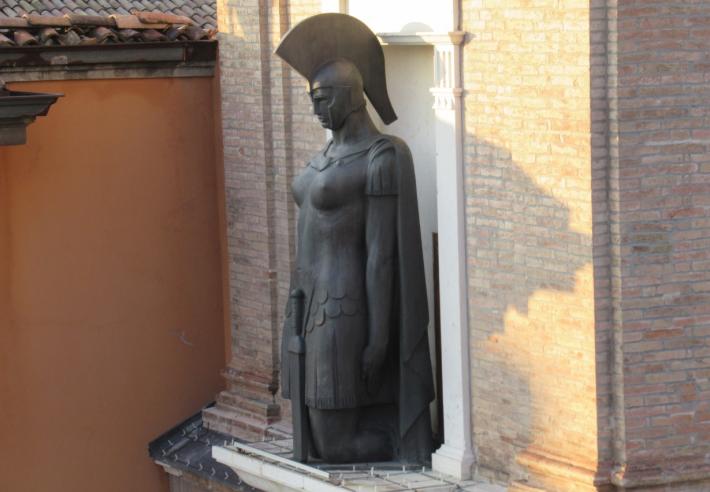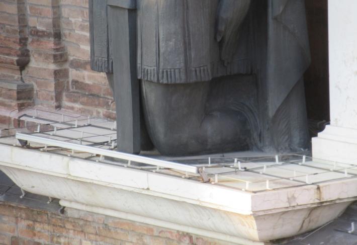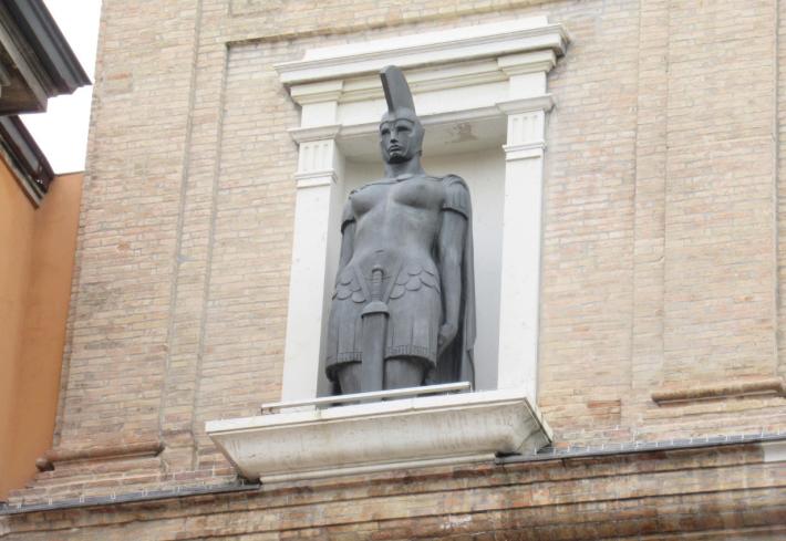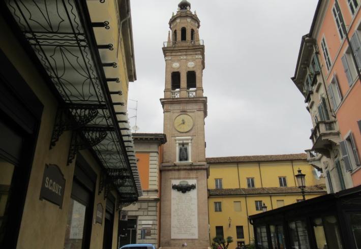 In fondo a via Cavour, all’angolo con via Melloni, c’è il monumento ai Caduti che tutti i parmigiani conoscono. Forse, però, non tutti sanno che la statua che si trova a metà altezza dell’antico campanile di San Paolo, e che rappresenta la «Stirpe Italica», è inginocchiata: infatti dalla strada non è possibile vedere completamente la scultura. Dal terzo piano del palazzo a fianco del monumento, invece, la prospettiva cambia: si vede chiaramente che la figura di donna è inginocchiata.