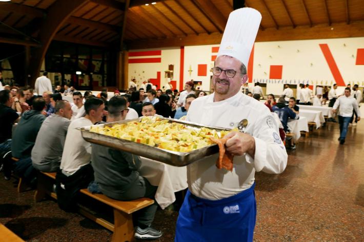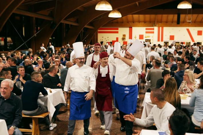I “ragazzi” si leccavano i baffi, l’altra sera. Mentre, entusiasti, tributavano un’ovazione alla “squadra” parmigiana, scesa “in campo” per un meritatissimo giro d’onore. I “ragazzi” – così, semplicemente, li chiamano – sono i 1.322 ospiti di San Patrignano, in cerca di una nuova vita dopo aver inciampato nella droga nella prima. Il “campo”, il gigantesco salone da pranzo, con tavoli imbanditi a perdita d’occhio: oltre millecinquecento coperti. La “squadra”, il gruppo di cuochi parmigiani che hanno raccolto una sfida che avrebbe spaventato chiunque, ma non loro: preparare una cena stellata per tutti i “ragazzi” e per gli ospiti (tanti, tantissimi) che hanno scelto di partecipare per dare il proprio contributo alla comunità.