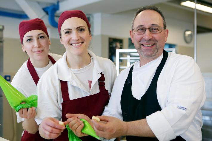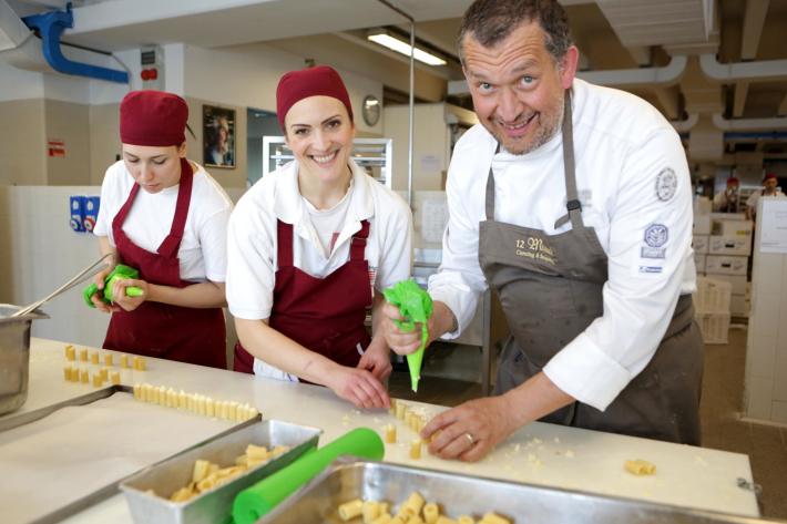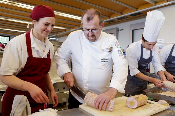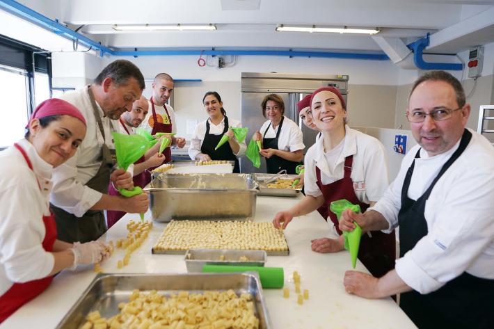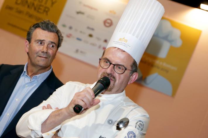 Una vera e propria macchina da guerra. Il primo a salire a bordo è stato Fabio Romani (ristorante Romani), che ha firmato con Spigaroli il menu della serata. Poi hanno aderito tanti cuochi di Parma quality restaurants: Enrico Bergonzi e Marco Pizzigoni (Ristorante Al Vèdel), Francesco, Barbara e Luca Dall’Argine (Antica Hostaria Tre Ville), Isabella Chiussi (Osteria Il Bersò), Nico Tamani (Vecchia Fucina), Filippo Cavalli (Osteria dei Mascalzoni), Francesca Toma (Vecchio Borgo), Maria Anedda (Les Caves), Michele Buia (Il Cortile), Simone Berzolla (Giorgione’s) e Andrea Nizzi (12 Monaci). E Claudio Gatti (pasticceria Tabiano). E tante aziende hanno fornito prodotti e generosi contributi. Tra i primi e più entusiasti sostenitori, l’osteopata Mauro Fornari, creatore e anima del Collegio italiano di osteopatia, che conosce San Patrignano come il suo ambulatorio, dopo tanti anni di assidua attività da volontario.