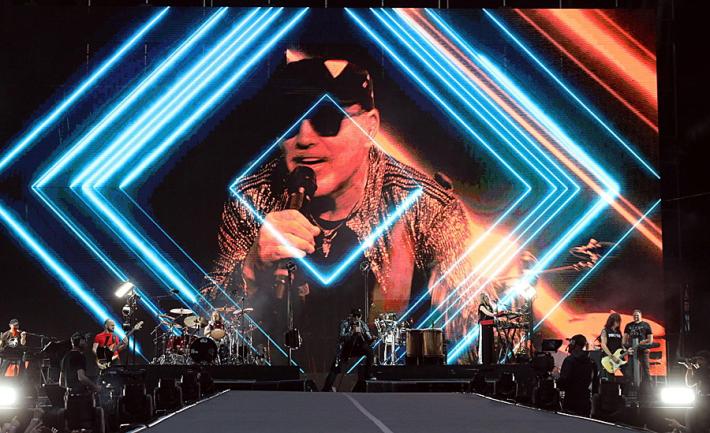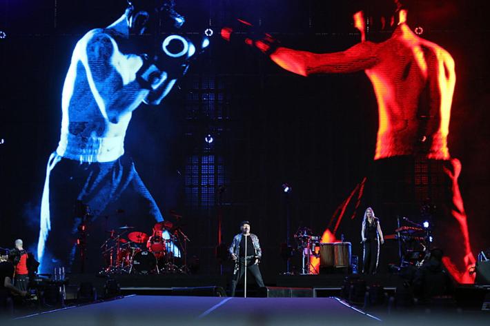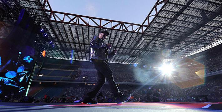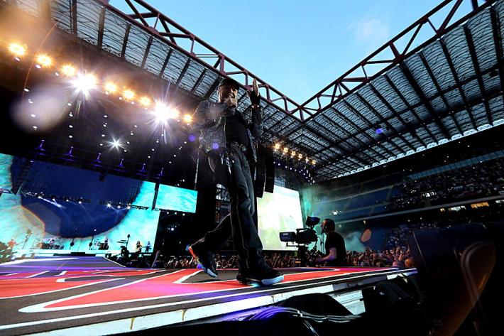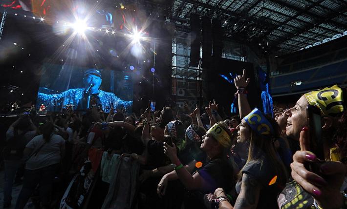 Si ricomincia con 'Portatemi Diò e gli 'Spari soprà, il light designer Giovani Pinna sceglie il rosso per sottolineare il momento, mentre la regia di Pepsy Romanoff accompagna il Blasco con una narrazione per immagini che non supera mai (per fortuna) le sue parole. «Io no, non ti lascerò mai» canta rivolto al suo pubblico e al momento di 'Rewind’scoppiano reggiseni come i fuochi d’artificio della chiusura. Qualcuno arriva sul palco, Vasco ne afferra uno, lo bacia e lo rilancia indietro ringraziando.