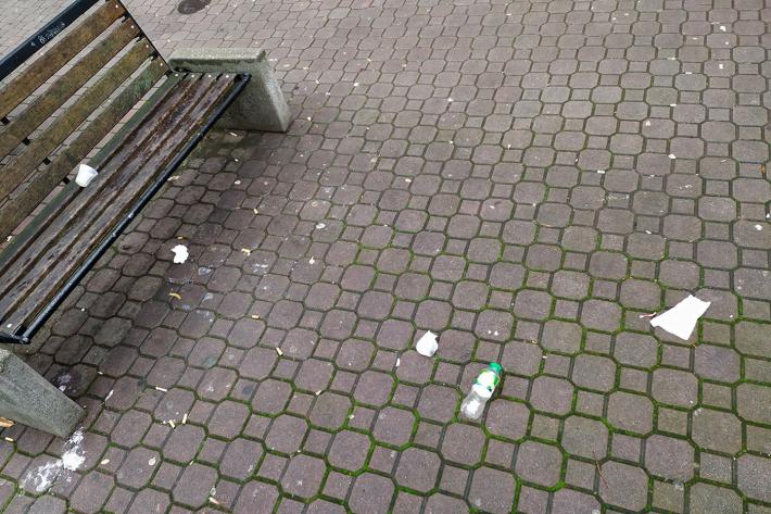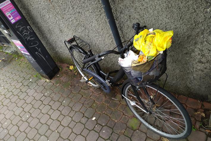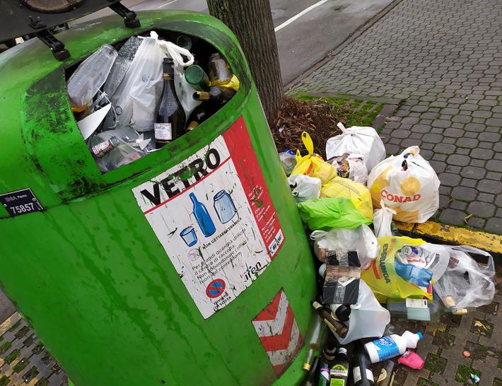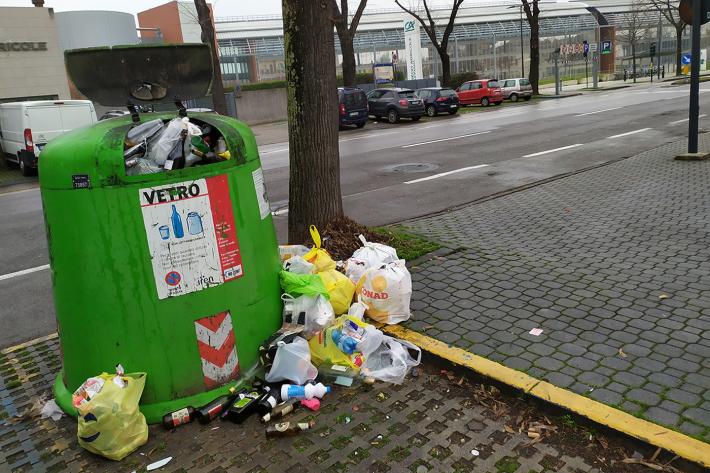 Impossibile non notarli, anche solo per la quantità in un'area limitata. Degrado in viale Mentana all'altezza del Duc, dove i rifiuti abbandonati hanno circondato la campana della raccolta del vetro e riempito il cestino di una bicicletta.