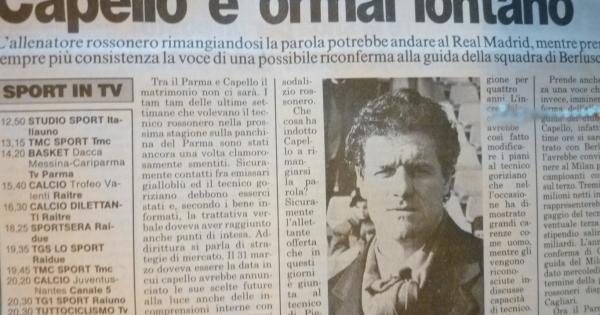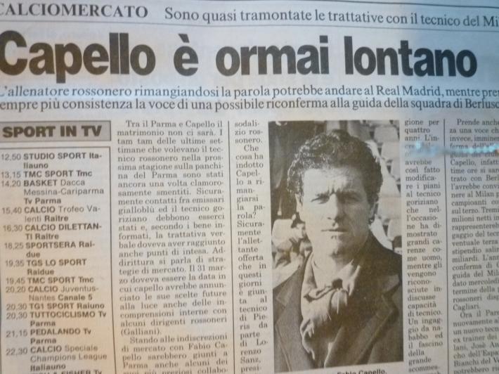 "Capello ormai lontano". Don Fabio si era "rimangiata" la parola data al Parma calcio, ed era tornato fra le realtà metropolitane di Milan e Real Madrid. Chissà come sarebbero andate le cose con a Parma il tecnico allora più conteso del mondo, che forse avrebbe potuto offrire alla realtà gialloblù quel pizzico di esperienza che poteva ancora mancare in società per il grande salto.