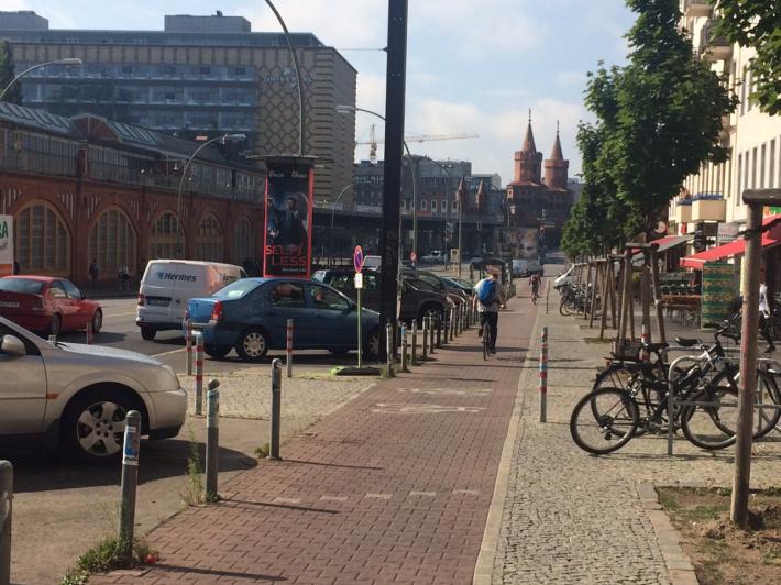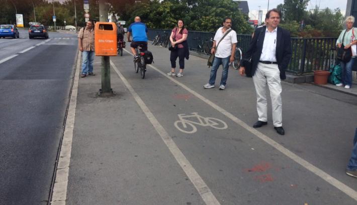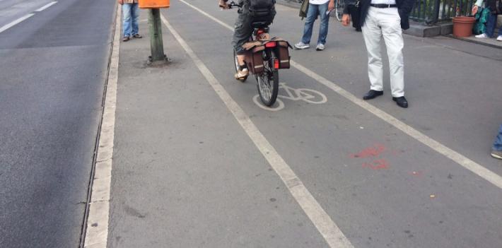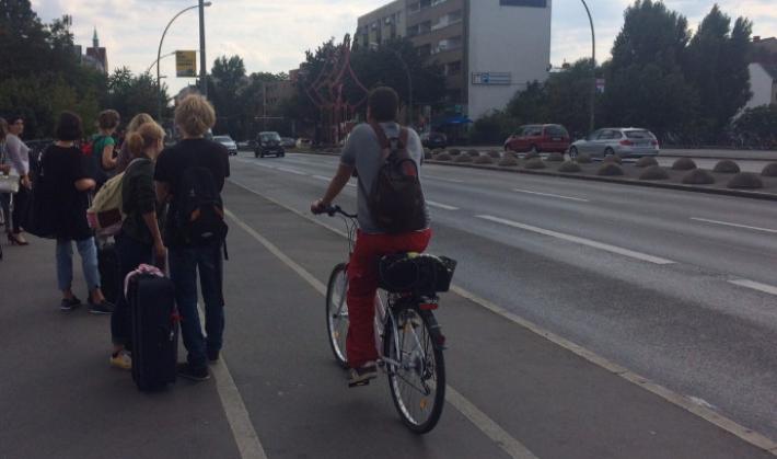 Ma a volte, forse, basterebbe un po' di buon senso. Lo dimostrano queste foto scattate in Germania, precisamente a Berlino. Documentano le piste ciclabili della città tedesca: come si vede, se in alcuni casi sono larghe e colorate, in altre - proprio come a Parma - sono solo disegnate con una riga sul marciapiede. Ed anche in prossimità di una fermata di bus, dove la convivenza è inevitabile e potenzialmente problematica, potete vedere nella foto come nessun pedone si sogni di oltrepassare la linea e come oi ciclisti possano quindi transitare agevolmente, se non al momento dell'arrivo del bus quando le parti si invertono: i pedoni "invadono" per pochi secondi la corsia e i ciclisti attendono che si sia completata la salita/discesa dal bus.