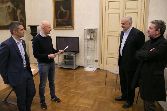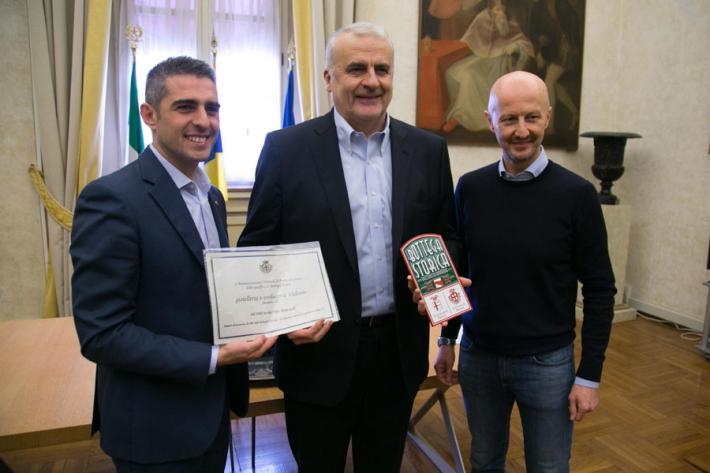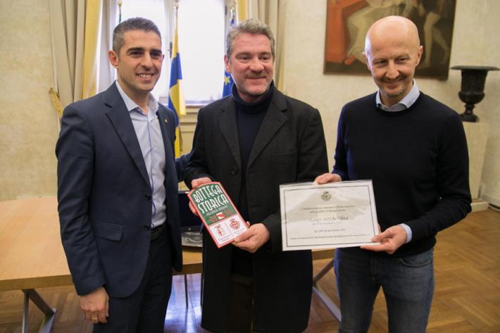 E' stata consegnata oggi la targa di “Bottega Storica” a due realtà commerciali che hanno segnato la storia di Parma: il negozio di “Stampe Antichie Oliva” , dal 1897 in via Duomo 1/D ed alla “Orologeria e Oreficeria Valenti”, dal 1949 in via Bixio 63. Alla cerimonia hanno partecipato il sindaco Federico Pizzarotti, l'assessore alle Attività Produttive Cristiano Casa, Paolo Valenti con la moglie Sandra ed i figli Michele e Giulio per la Orologeria e Gioielleria Valenti e Nicola Soncini per Stampe Antiche Oliva.