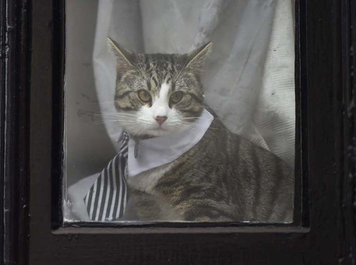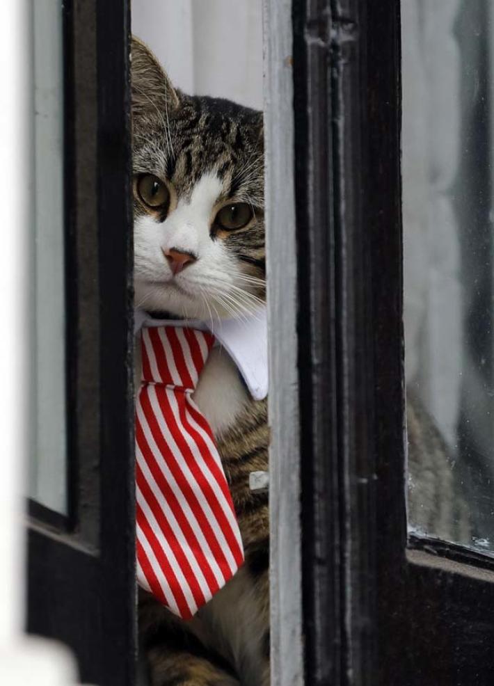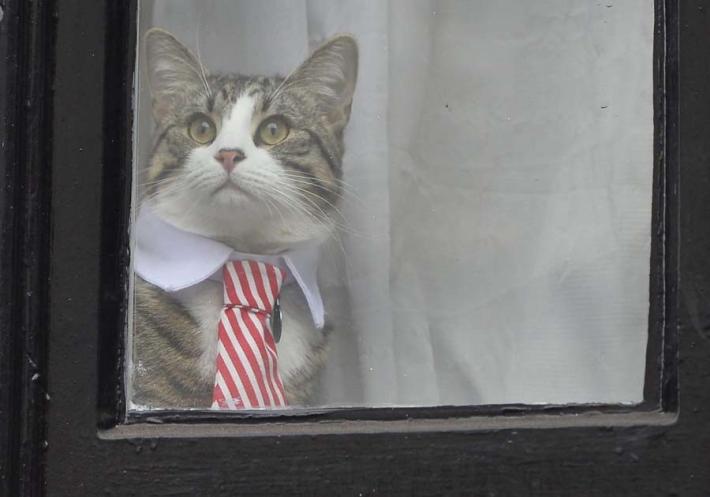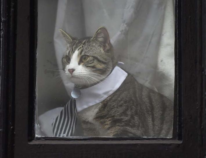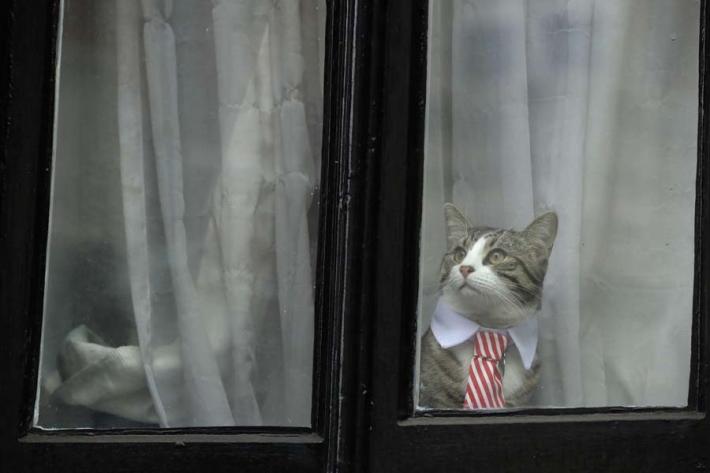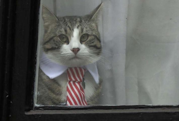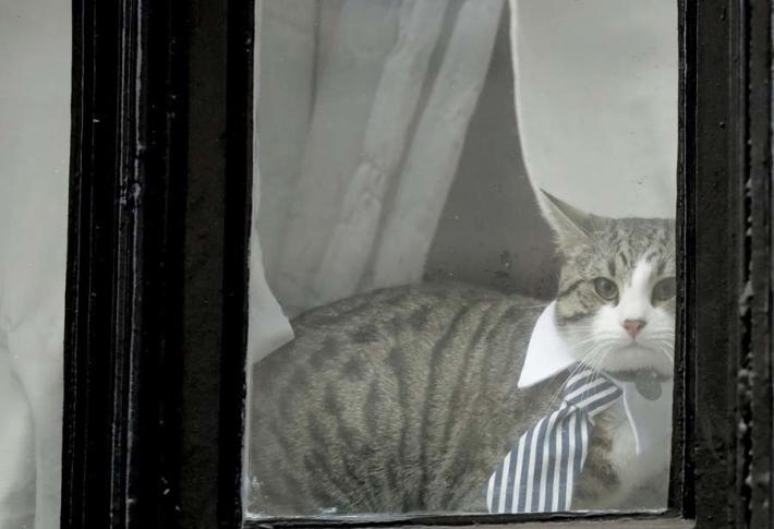 I pm della Svezia hanno sentito Julian Assange (accusato di abusi sessuali) nell'ambasciata dell'Ecuador a Londra, nel più stretto riserbo... Così cameraman e fotografi assiepati attorno all’ambasciata con alcune decine di manifestanti che chiedevano «giustizia e libertà» per il paladino di Wikileaks non è rimasto che concentrare le attenzioni sul gatto incravattato comparso sul davanzale della finestra di una stanza che ospita Assange.