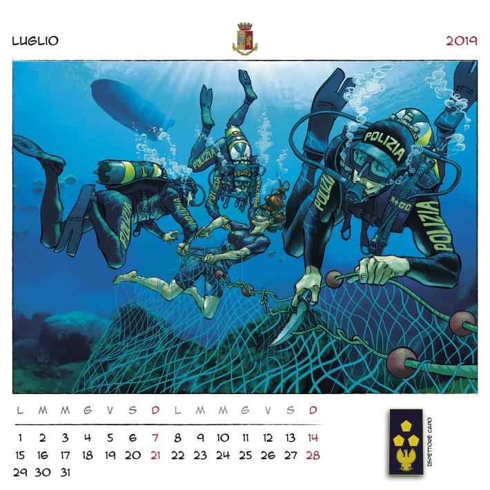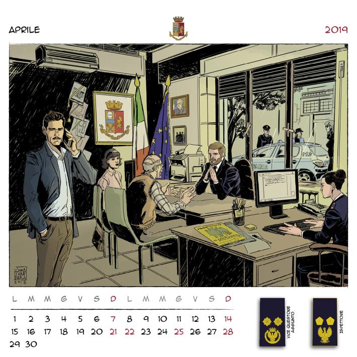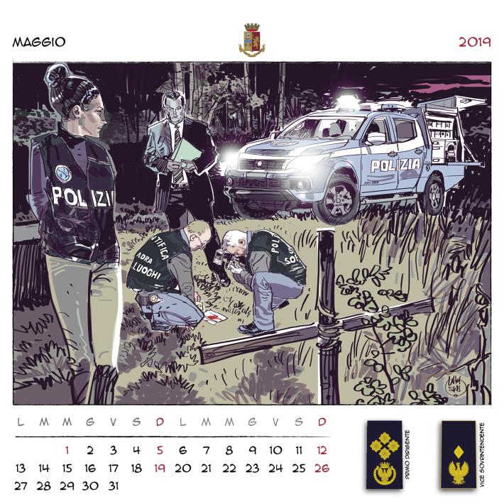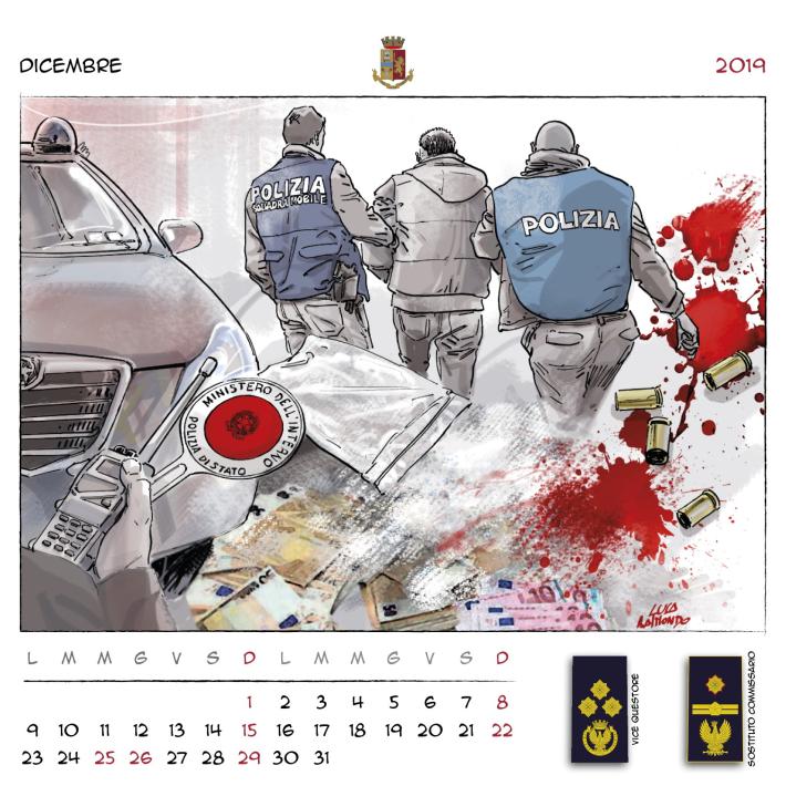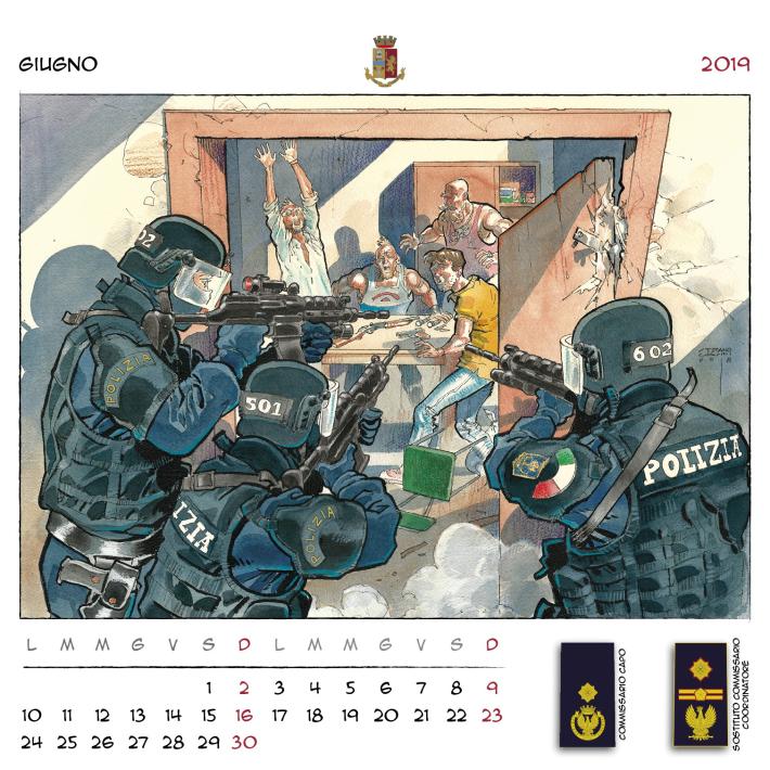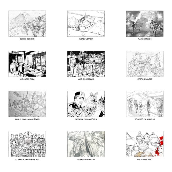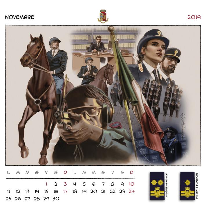 Quest’anno la Polizia ha scelto di raccontare la sua attività attraverso il linguaggio dell’arte grafica, con dodici inedite illustrazioni, realizzate da prestigiosi disegnatori di fumetto. Tra gli artisti figurano Bruno Brindisi, tra i più noti fumettisti della casa editrice Bonelli che, insieme a Roberto De Angelis e Luca Raimondo, firmano personaggi del tenore di Dylan Dog, Tex e Nathan Never; ma anche autori quali Raffaele della Monica, Daniele Bigliardo, Luigi Siniscalchi, Walter Venturi, Massimiliano Bertolini, Raul e Gianluca Cestaro, Stefano Casini fino al più giovane Jonathan Fara, disegnatore del made in Polizia di Stato “Commissario Mascherpa”. Il fumetto, quindi, quale mezzo di rappresentazione del presente e immaginazione del futuro.