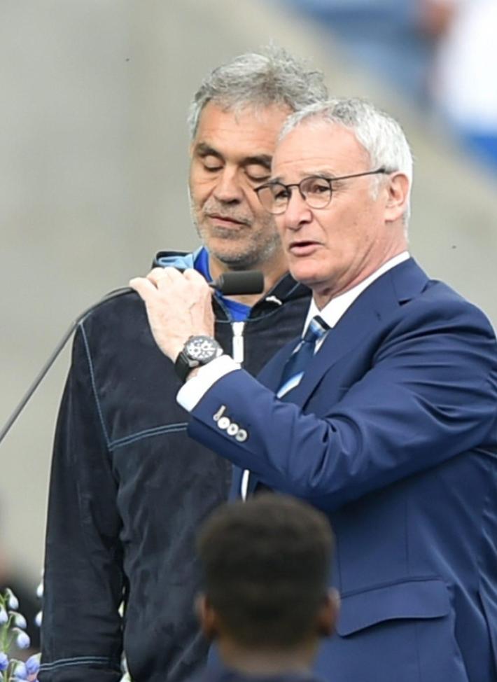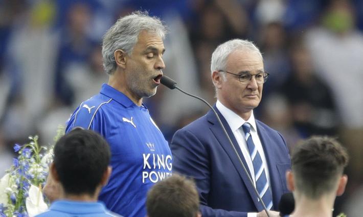 Impettito e commosso, Claudio Ranieri ha seguito l’esibizione di Andrea Bocelli, prima della partita del Leicester, al fianco del tenore italiano. Uno spettacolo nello spettacolo: tutto lo stadio colorato di blu e bianco, mentre risuonavano le note di «Nessun Dorma» e «Con te partirò». Era stato lo stesso Bocelli a promettere a Ranieri di esibirsi al King Power stadium qualora le Foxes avessero vinto il titolo. Promessa mantenuta, prima del fischio d’inizio dell’ultima gara casalinga del Leicester, contro l’Everton.