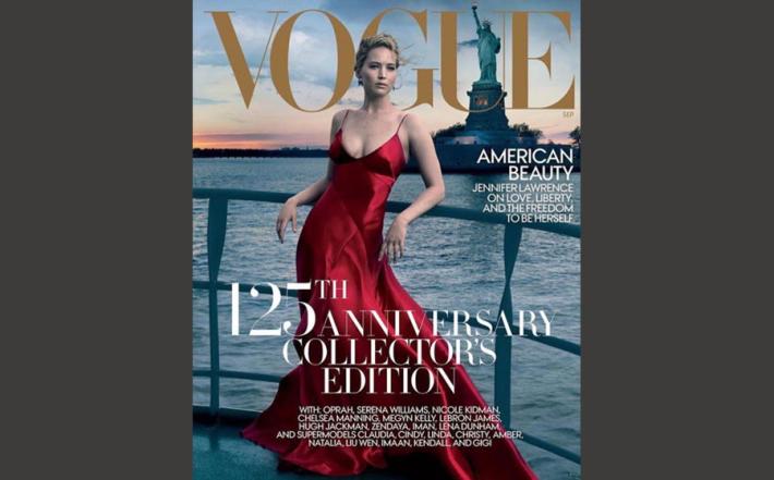 Jennifer Lawrence in abito da sera color fiamma sullo sfondo della Statua della Libertà al tramonto: la copertina del «September issue» di Vogue ha fatto veder rosso a Breitbart, il sito di informazione legato allo stratega della Casa Bianca, Steve Bannon.