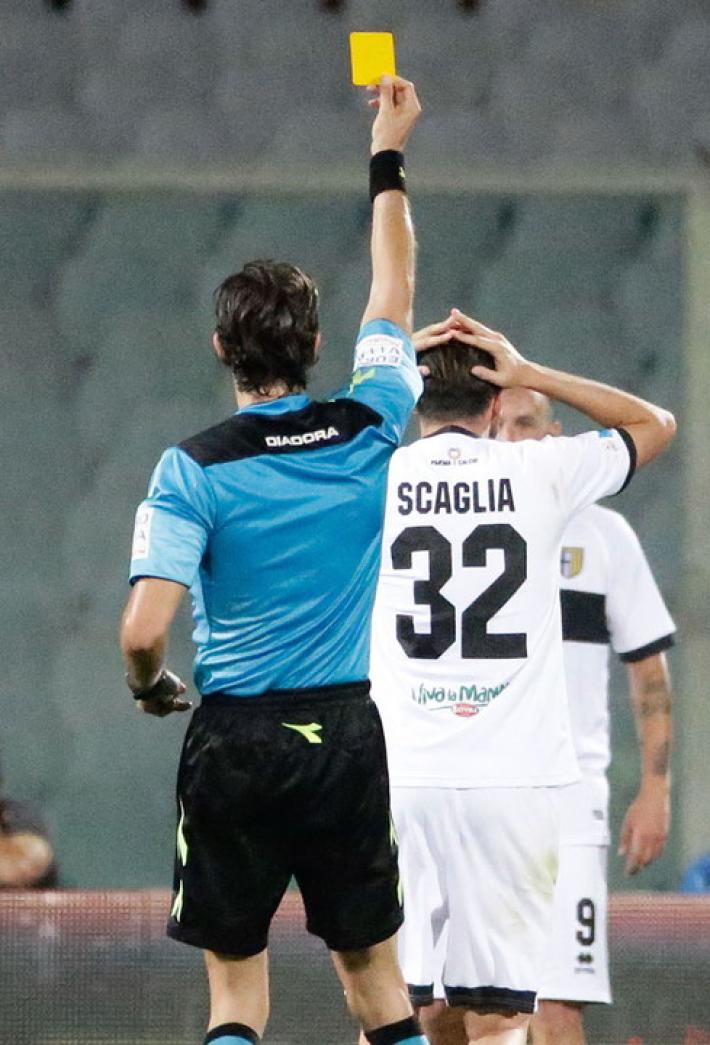Braccio largo di Scaglia al 76': Pillitteri ammonisce il giocatore del Parma.