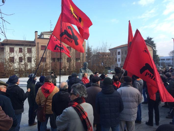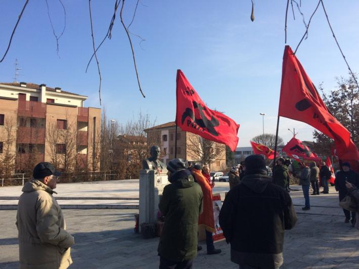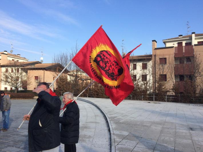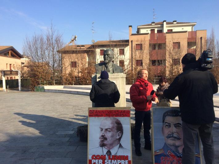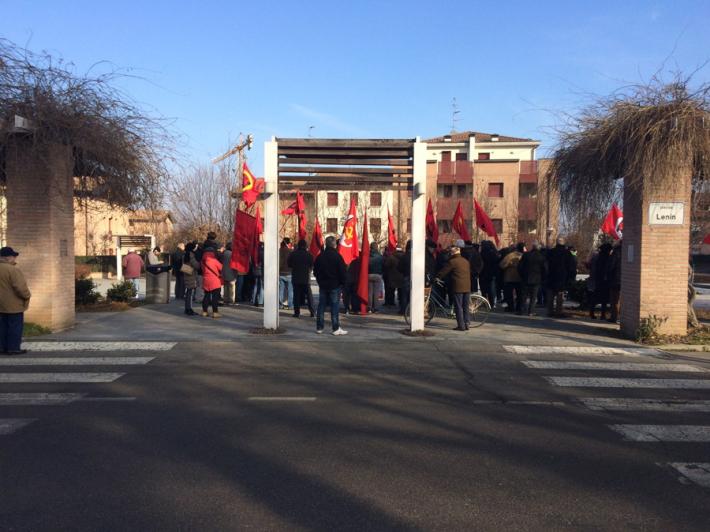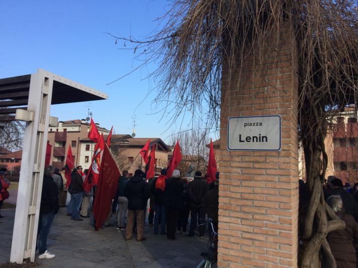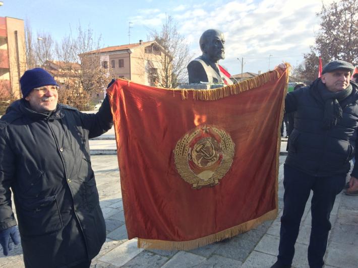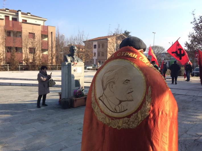 Bandiere rosse con falce e martello ieri a Cavriago per il 93º anniversario della morte di Lenin. L'iniziativa ("Con Lenin per sempre!"), organizzata congiuntamente dal Partito comunista italiano e dal Partito marxista-leninista italiano, fa parte delle celebrazioni per il centenario della Rivoluzione d'Ottobre.