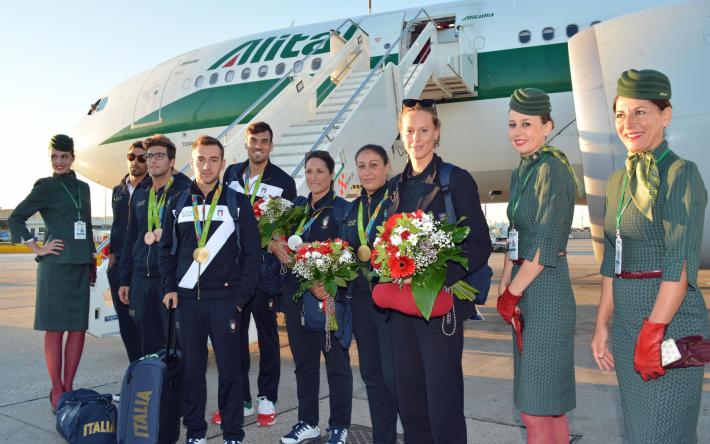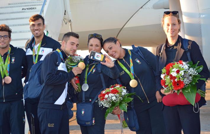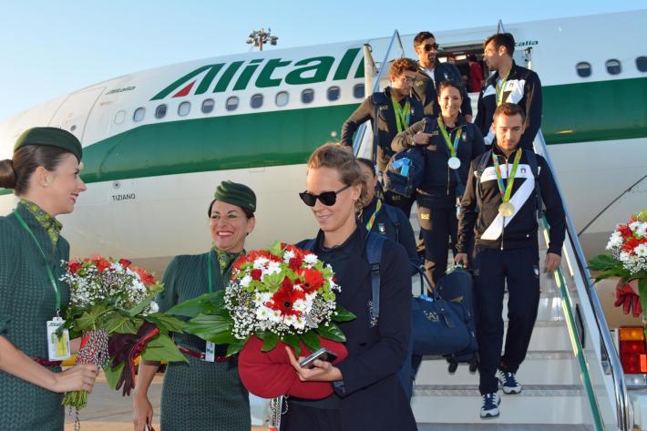 A strappare un sorriso agli atleti olimpionici, apparsi piuttosto stanchi e insonnoliti, forse anche per il lungo viaggio, è stato l’omaggio floreale donatogli dalle hostess di Alitalia sotto bordo dell’Airbus A-330. Subito dopo la comitiva azzurra, assistita per tutto il tempo dal personale della compagnia aerea, appena ha fatto ingresso nel Terminal 3 arrivi è stata accolta festosamente dai passeggeri in transito e dal personale aeroportuale. Festa a sorpresa per Gabriele Rossetti, che ha trovato ad accoglierlo alcuni uomini delle Fiamme Oro con la bandiera dell’Italia.