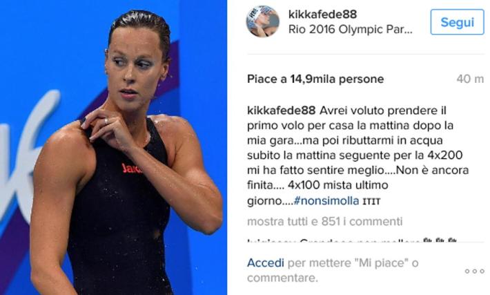 Federica Pellegrini l’aveva detto che non voleva chiudere così, non con i risultati poco positivi dopo il quarto posto nei 200 stile libero e l'eliminazione nella staffetta 4x200 sl. E, infatti, oggi, su Instagram annuncia che scenderà in vasca anche per la 4x200 misti. "Avrei voluto prendere il primo volo per casa la mattina dopo la mia gara...ma poi ributtarmi in acqua subito la mattina seguente per la 4x200 mi ha fatto sentire meglio....Non è ancora finita.... 4x100 mista ultimo giorno....non si molla" scrive la campionessa azzurra.