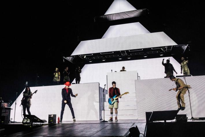 «Abbiamo raggiunto questi numeri - hanno detto i due - perchè siamo trasversali. Se si andasse a guardare i video che abbiamo girato durante gli instore ci si accorgerebbe che a sentirci non vengono solamente i bambini». I giovanissimi nel pubblico, però, per la prima data torinese, erano sicuramente la maggioranza assoluta e cantante. A dominare tutto il concerto, davanti anche a qualche personaggio noto come Chiara Ferragni (presa d’assalto a suon di selfie) e Andrea Agnelli, è poi la simbologia della piramide, con tanto di palco a più piani e proiezioni video, a rappresentare la scalata sociale tanto di Fedez, al secolo Federico Lucia, quanto di J-Ax, all’anagrafe milanese Alessandro Aleotti.