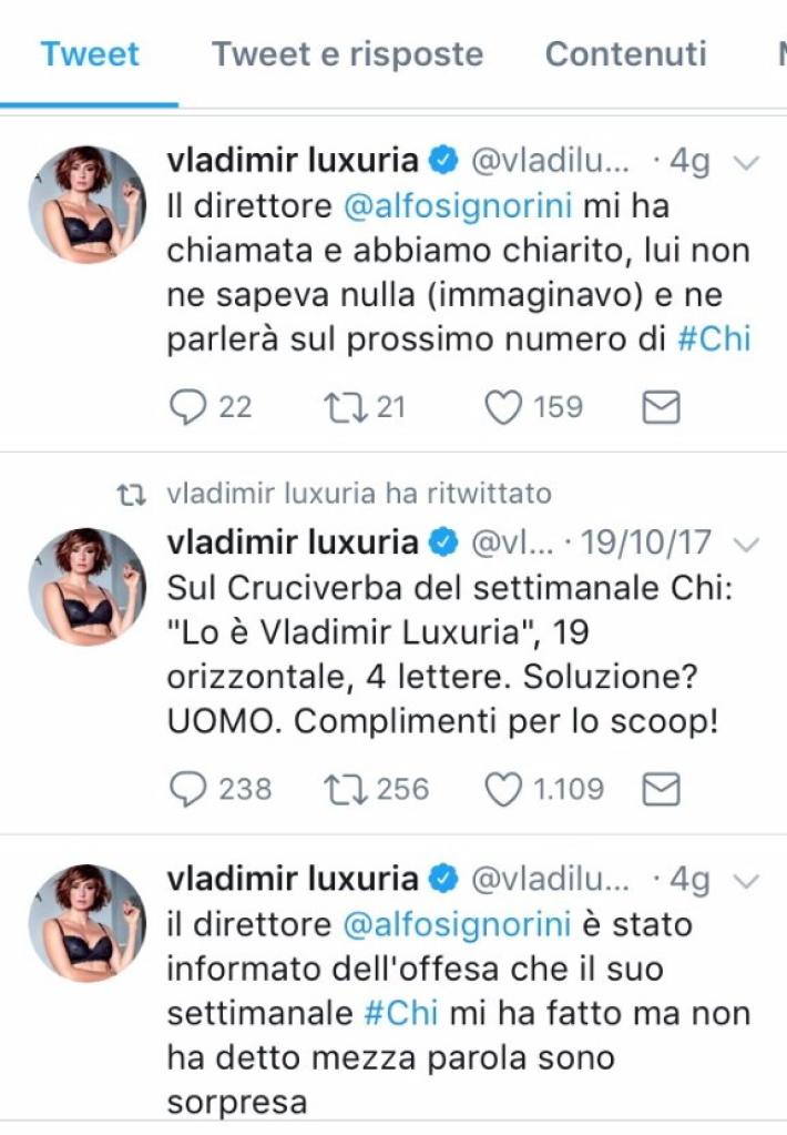 E’ scontro a distanza, con corollario social, tra Vladimir Luxuria e il cruciverbista del settimanale "Chi", il reggiano Big Bonvi (al secolo Fabrizio Bonvicini, ex dj). Sul numero 44 del settimanale diretto da Alfonso Signorini è stato pubblicato un "Cruci-Gossip". Una delle definizioni recitava: «Lo è Vladimir Luxuria». La risposta prevista per far "quadrare" il cruciverba era «uomo».