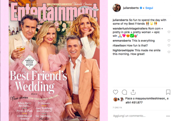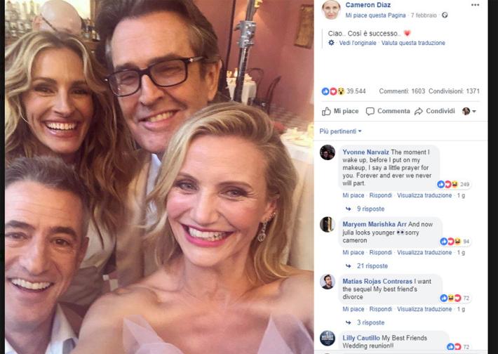 Lo scatto mostra i quattro protagonisti del film «Il matrimonio del mio migliore amico», protagonisti 22 anni dopo di una reunion organizzata dalla rivista «Entertainment Weekly» per celebrare la commedia romantica che nel 1997 aveva sbancato il box-office (quasi 300 milioni di dollari). Nel selfie postato su Instagram, Cameron Diaz è insieme a Julia Roberts, Dermot Mulroney e Rupert Everett: «Finalmente è successo» recita la didascalia.