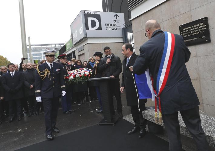 Davanti alla porta D, dove morì Manuel Dias, autista di un pullman che aveva accompagnato un gruppo di tifosi alla partita amichevole Francia-Germania, il presidente Francois Hollande, al fianco del primo ministro Manuel Valls, ha scoperto una lapide.