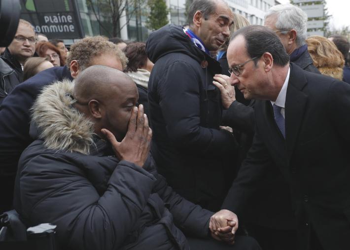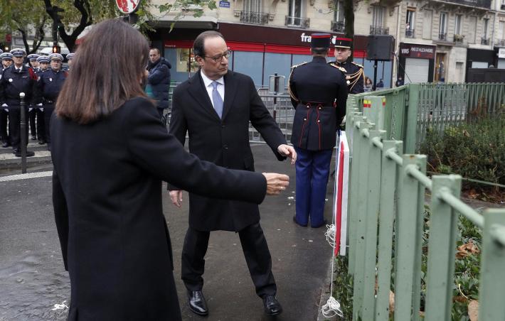 Ore 10 - Dopo lo Stade de France, Francois Hollande si è spostato nel XI e nel X arrondissement dove ha scoperto - al fianco della sindaca Anne Hidalgo - lapidi davanti ai bistrot delle stragi di un anno fa.