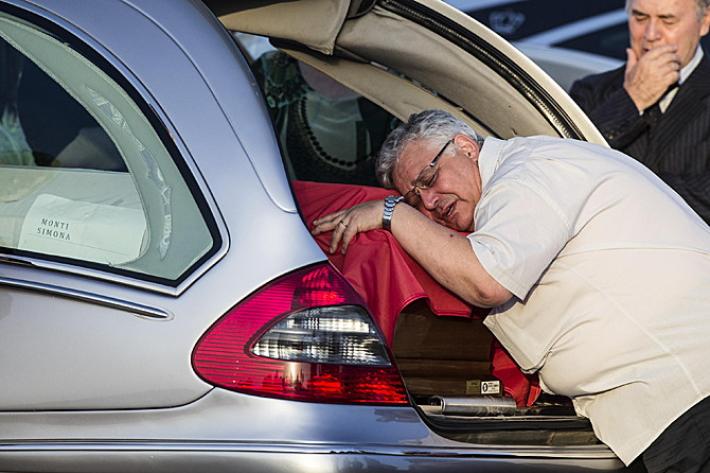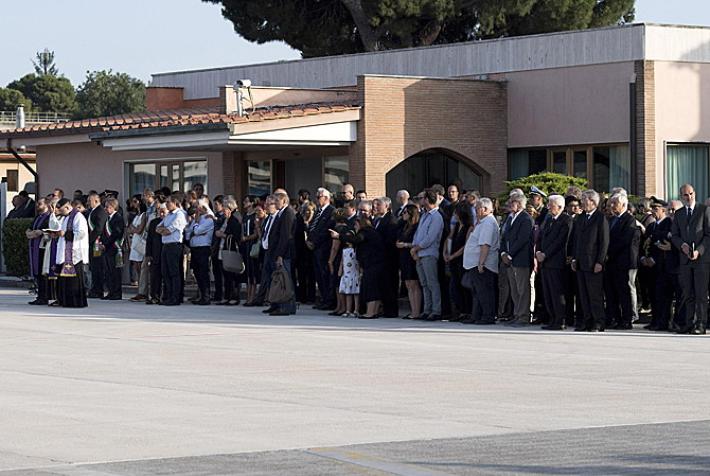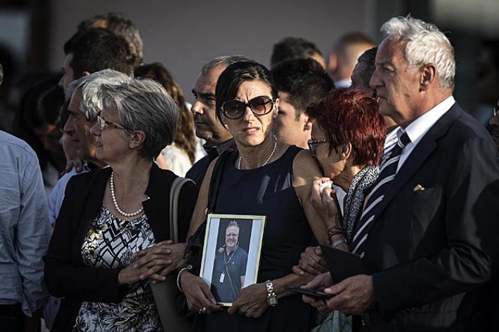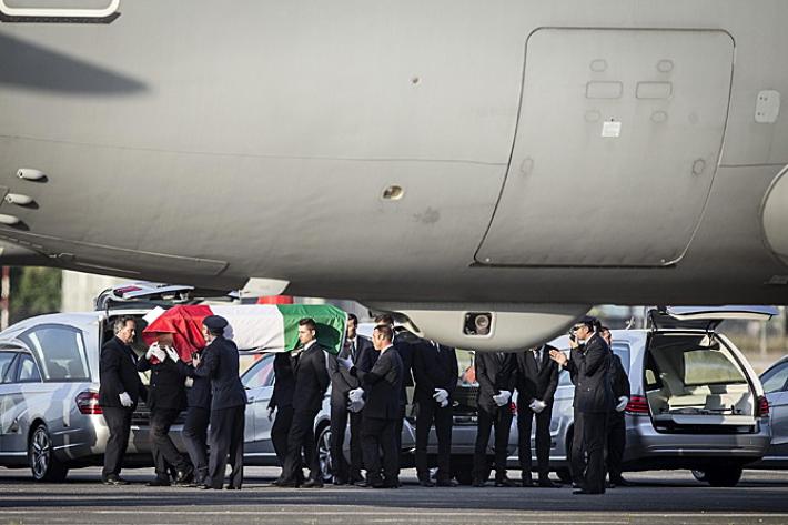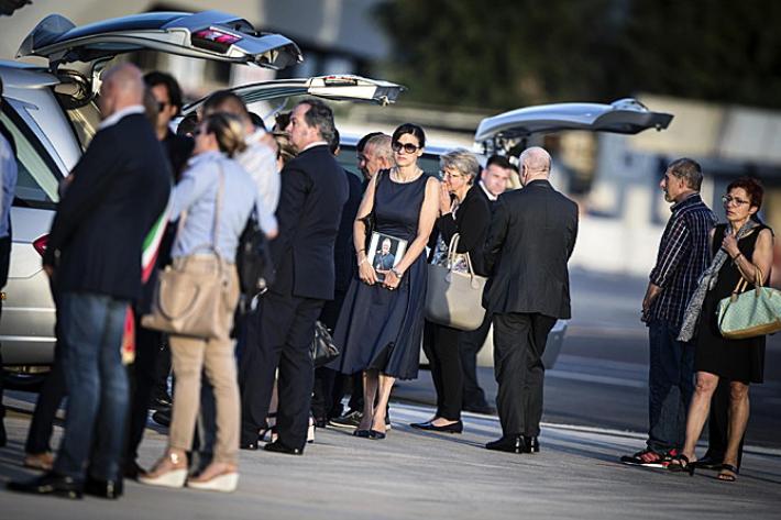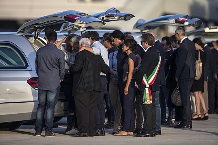 Gentiloni è stato accanto al capo dello Stato durante le lunghe operazioni di sbarco dei feretri (un’ora circa), al termine delle quali Mattarella si è fermato per un istante in raccoglimento davanti alle bare, un istante appena per poi lasciare subito spazio ai familiari, al loro dolore per l’ultimo saluto ai congiunti. Lacrime, abbracci, lo straziante saluto di don Luca Monti, il fratello di Simona, che ha baciato piangendo il feretro della trentenne che aveva da poco scoperto di aspettare un bambino. E poi ancora, tra i familiari, una bimba con il suo vestito a fiori e un nastro tra i capelli ferma in attesa delle bare e Giovanni Boschetti, che è riuscito a salvarsi mentre sua moglie veniva massacrata e una giovane donna, con in mano una cornice con la foto di Cristian Rossi, il manager di 47 anni che aveva due gemelline di tre anni.