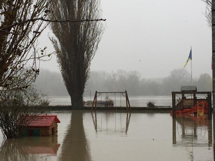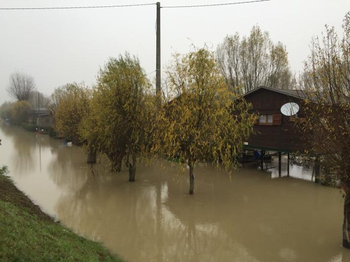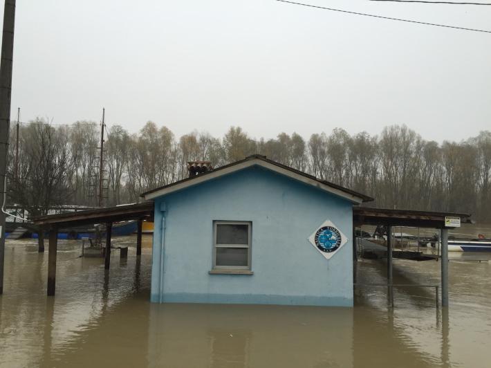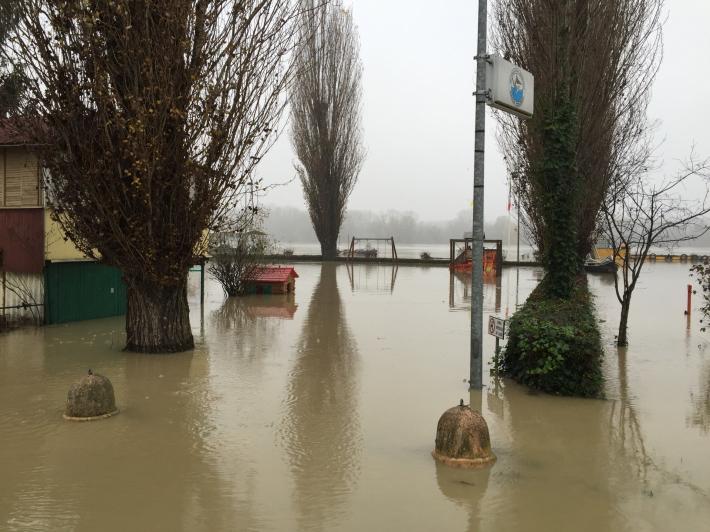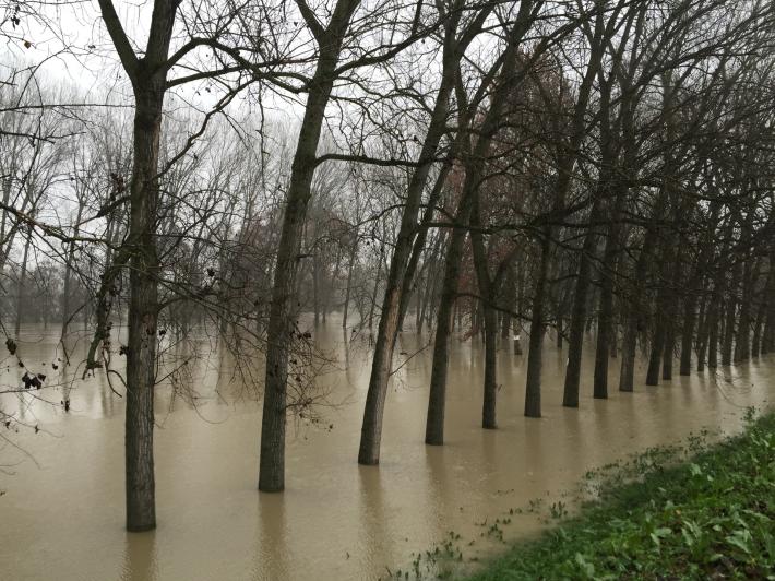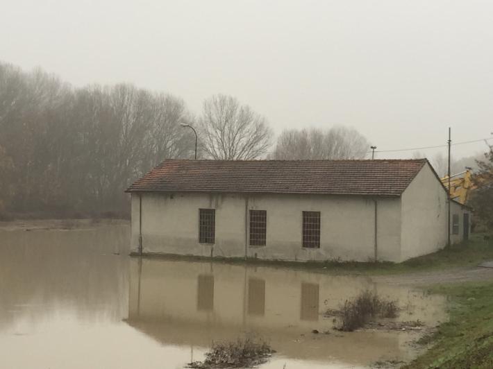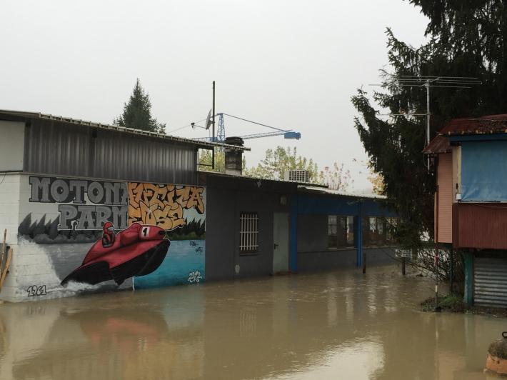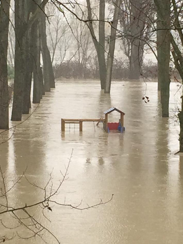 Nelle foto di Cristian Calestani si notano gli allagamenti nelle zone golenali, in particolare le aree giochi del parco Boschi Maria Luigia di Coltaro e quella della motonautica di Sacca di Colorno.