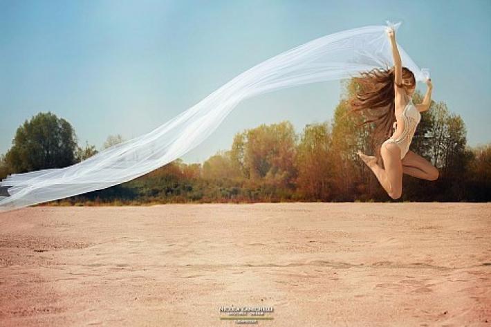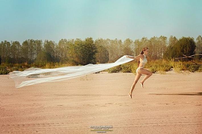 La ragazza corre su una "spiaggia del Po" con il suo leggero vestito bianco. Fa volare il lungo strascico e salta felice. Poi si mette in posa per il fotografo su un tronco dello "spiaggione" o sdraiata sulla sabbia. Questo "raccontano" gli scatti del fotografo parmigiano Nicola Zanichelli. La protagonista del servizio fotografico, intitolato Flowing, si chiama Gytaute e vive a Parma (assistant: Giuliano Chezzi). Nei giorni scorsi Zanichelli e Gytaute hanno realizzato gli scatti lungo il Po fra Stagno e Torricella.