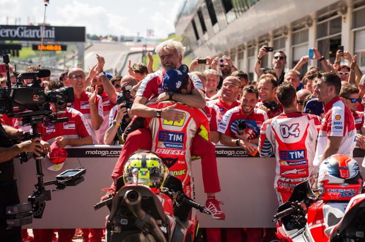 Doppietta Ducati in Austria con i due Andrea, Iannone e Dovizioso, primo e secondo. Un successo che a Borgo Panigale attendevano da quasi sei anni. Era stato Casey Stoner l’ultimo a tagliare per primo il traguardo in sella alla Rossa delle due ruote, il 17 ottobre 2010, sul circuito di Philip Island. Terzo e quarto posto per le Yamaha di un rinato Jorge Lorenzo, davanti a Valentino Rossi incapace di attaccare il compagno di team. Quinta la Honda di Marc Marquez, il leader del Mondiale apparso in difficoltà e mai protagonista.