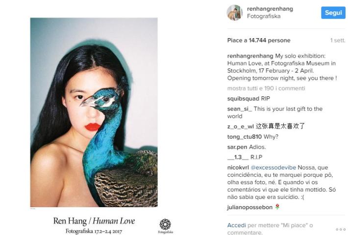 Tra i suoi sostenitori anche Ai Wei Wei che nel 2013 lo aveva invitato alla collettiva Fuck off 2, al Groninger Museum. Considerato tra le voci più innovative della fotografia, Ren Hang era noto soprattutto per i suoi nudi, provocatori ma anche poetici, a causa dei quali era stato censurato, denunciato e anche arrestato in Cina con l’accusa di pornografia. Lui si difendeva: «Le idee politiche espresse nelle mie foto non hanno niente a che vedere con la Cina, è la politica cinese che vuole introdursi nella mia arte». Ren Hang era da tempo in lotta con la depressione e secondo il suo entourage si sarebbe suicidato. «Ogni anno mi faccio la stessa promessa: morire prima» ha scritto in uno dei suoi ultimi post, pubblicato alla vigilia del Capodanno cinese. Per lui una pioggia di omaggi, oltre che da siti specializzati e riviste internazionali e cinesi, anche da parte dei suoi tantissimi fan sui social. Al Foam di Amsterdam è in ancora in corso fino al 12 aprile la sua mostra Ren Hang. Naked/Nude. Mentre è stato recentemente pubblicato da Taschen il volume Ren Hang curato dalla scrittrice, storica ed editrice di magazine pornografici Dian Hanson.