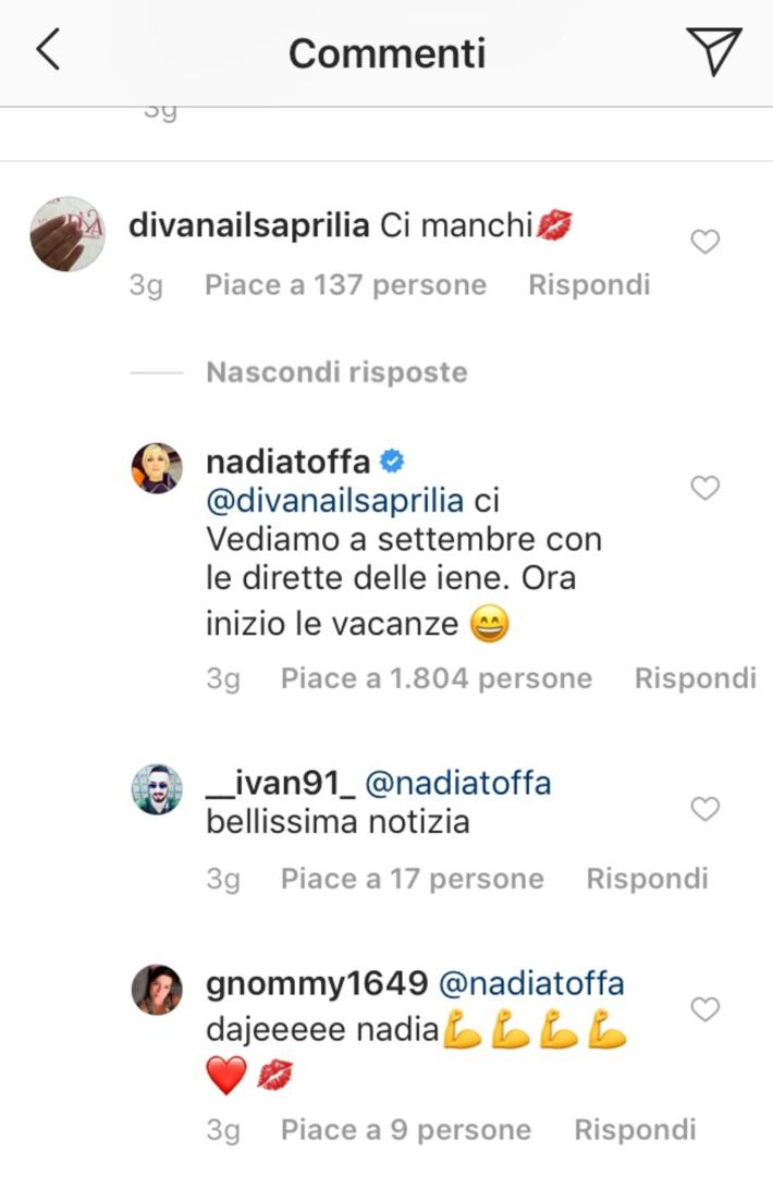 Nadia Toffa tornerà presto in televisione con Le Iene e in diretta. Ad annunciare la notizia è stata la conduttrice su Instagram che ha risposto a un follower che le chiedeva quando sarebbe tornata in tv: «Ci vediamo a settembre con le dirette delle Iene - ha replicato -. Ora inizio le vacanze». Parole che hanno rassicurato i suoi fan sulle sue condizioni di salute. Toffa nelle ultime settimane è tornata attiva sui social, dopo una lunga fase di silenzio.