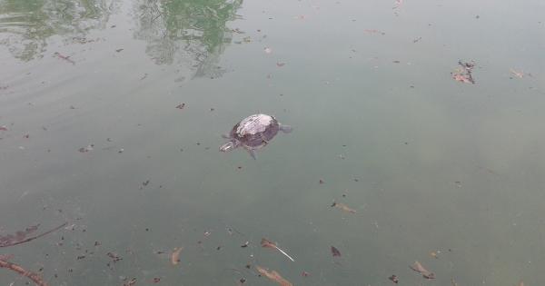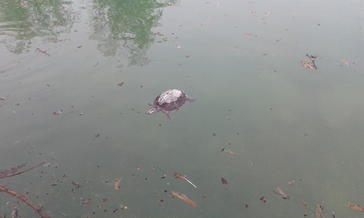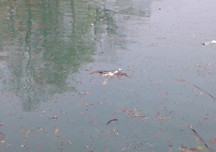 Due animali galleggiano privi di vita nel laghetto del parco Ducale: da una parte c'è una tartaruga, dall'altra un'anatra, quasi irriconoscibile se non fosse per la zampa palmata che si scorge appena sotto la superficie dell'acqua. Foto di: Mattia