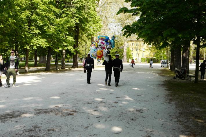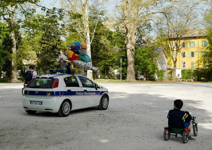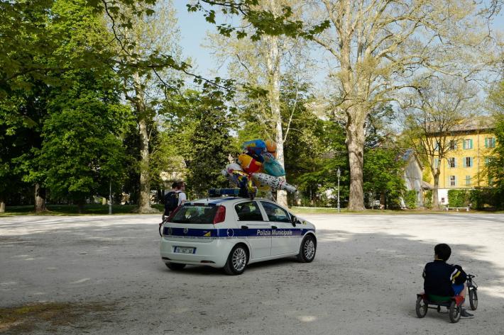 Nel pomeriggio la polizia municipale ha fermato un venditore di palloncini al Parco Ducale. L'uomo è stato fatto salire sull'auto di servizio però non c'era posto per i palloncini. Alla fine gli agenti sono partiti con i palloncini fuori dall'auto.