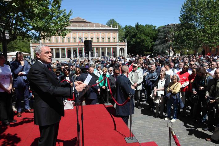 «Reggio Emilia - ha aggiunto Grasso - ha contribuito a quella causa in maniera straordinaria, pagando un prezzo altissimo e doloroso: 626 caduti fra i suoi oltre 9.500 combattenti volontari; 1200 civili deportati; più di 8.000 militari internati nei lager tedeschi; l'incendio di interi paesi; la vile uccisione di centinaia di civili, fra cui donne e bambini, vittime della barbara regola fascista della rappresaglia contro popolazioni incolpevoli e inermi. Un sacrificio giustamente riconosciuto con il conferimento alla città della Medaglia d’oro al valor militare, e con la gratitudine dell’Italia intera di cui oggi mi faccio interprete con commozione».