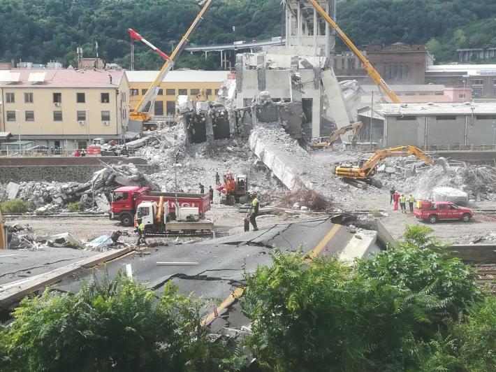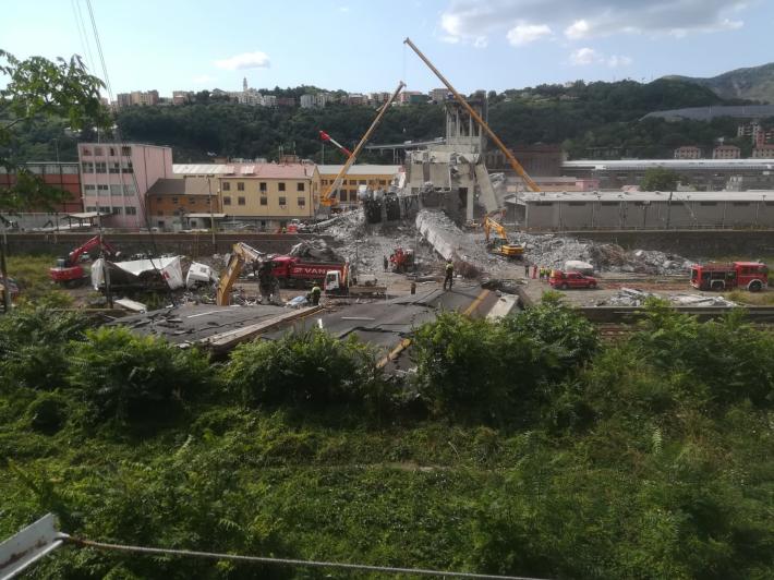 Gli interventi dei vigili del fuoco si concentrano in particolare sotto le macerie del pilastro che sosteneva il ponte e nella zona della ferrovia, entrambe sull'argine sinistro del Polcevera. Prima con le gru vengono rimossi pezzi di cemento più grandi e poi le squadre Usar verificano l’eventuale presenza di auto o persone.