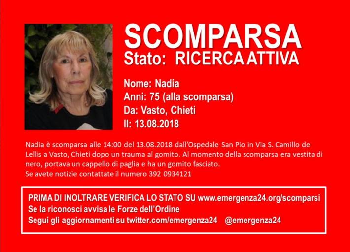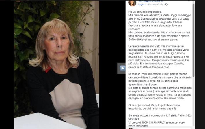 «Ho un annuncio importante. Mia mamma è in Abruzzo, a Vasto. Oggi pomeriggio(ieri, ndr.) alle 14,00 è andata all’ospedale del centro di Vasto perchè si era fatta male a un gomito. L’hanno fasciata e lasciata in una stanza per fare una risonanza. Mio padre si è allontanato. Mia mamma non ha mai fatto quella risonanza e da quel momento è sparita». Il messaggio è stato pubblicato in serata sul profilo fb della giornalista e opinionista Selvaggia Lucarelli. Che prosegue: «Soffre di Alzheimer, non si era mai persa. L’allarme alle forze dell’ordine è stato dato tardi, alle sei del pomeriggio, ora è notte e non si trova. Chiedo anche all’ospedale di cercarla ovunque, potrebbe essersi nascosta o non so. Io sono in Perù, mio fratello e miei parenti stanno cercando di fare il possibile ma serve che la si cerchi in fretta perchè è notte, ha 75 anni e sarà spaventata chissà dove. Se siete di quella zona e potete darmi una mano non so neppure io come (parlo specialmente a forze di polizia e carabinieri) è vestita di nero, ha un cappello di paglia, un braccio fasciato. Si chiama Nadia». Lucarelli pubblica anche il numero di telefono del fratello, invitando chi ha notizie a contattarlo.