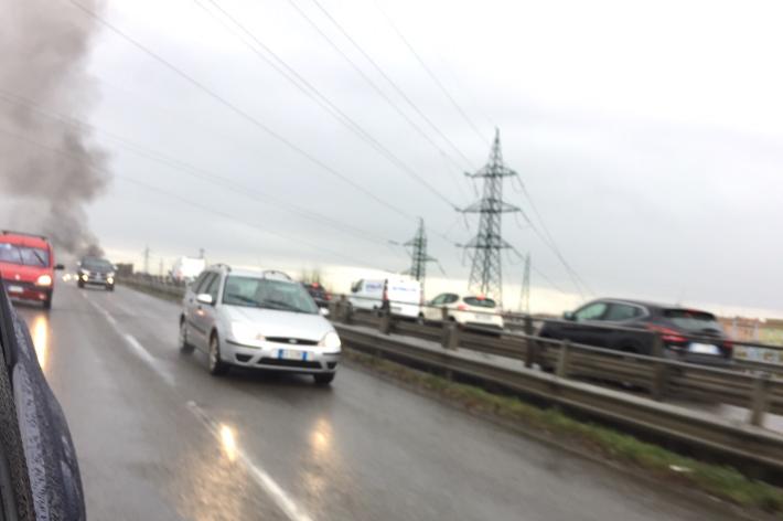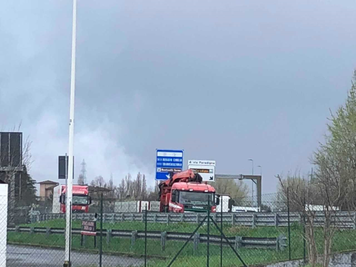 Come mostra il video, dall’area del Centro Torri si vede la colonna di fumo, si sente odore di fumo e cade cenere portata dal vento. Lunghe code in tangenziale.