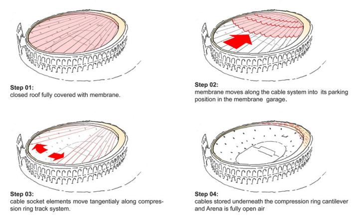 Il progetto che ha vinto è in pratica una sorta di moderno velario romano con i teli di copertura che poggiano su un solo ordine di cavi e un sistema di riavvolgimento a scomparsa che resta visibile in un unico lato. Il secondo classificato (rti Vincenzo Latina di Siracusa) prevede un sistema di camere d’aria che si gonfiano e si accostano su un anello reticolare. Il problema in questo caso, però, è che i cavi restano sempre visibili. Terzo classificato il progetto di una rti italo spagnola guidata da Roberto GM Ventura di Codogno che ipotizza di raccogliere il telo centralmente. Tutte le idee saranno comunque visibili in una mostra a palazzo della Gran Guardia.