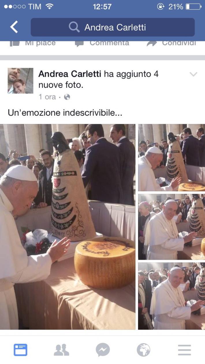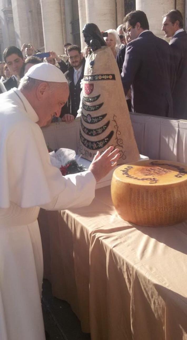 Una "delegazione" di Bibbiano ha portato il Parmigiano Reggiano al papa. Il gruppo della Val d'Enza reggiana ha partecipato all'udienza con Papa Francesco in Vaticano. Il sindaco Andrea Carletti ha postato su Facebook alcune foto di Francesco che osserva e pare apprezzare la forma di Parmigiano Reggiano. Il commento di Carletti: "Un'emozione indescrivibile".
