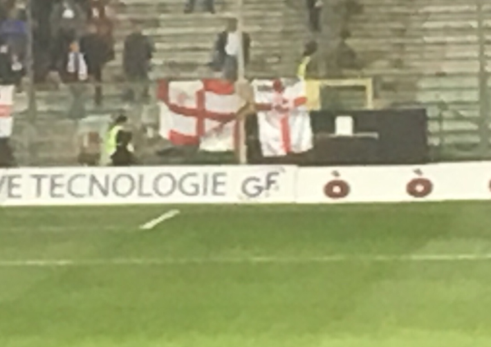 Una svastica al Tardini? E' quanto si vede a bordo campo durante la partita Parma-Padova, sul lato dei tifosi ospiti: una bandiera è girata in modo da formare una svastica rossa su sfondo bianco.