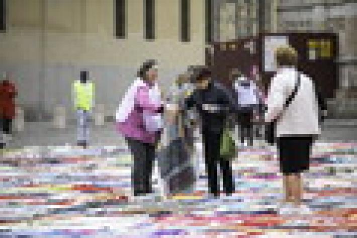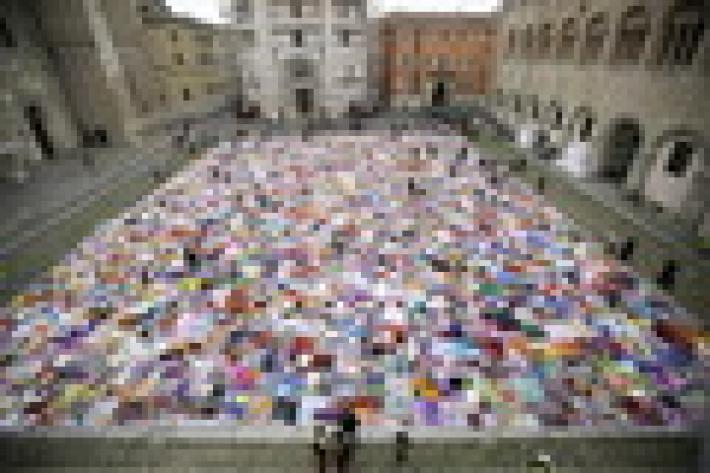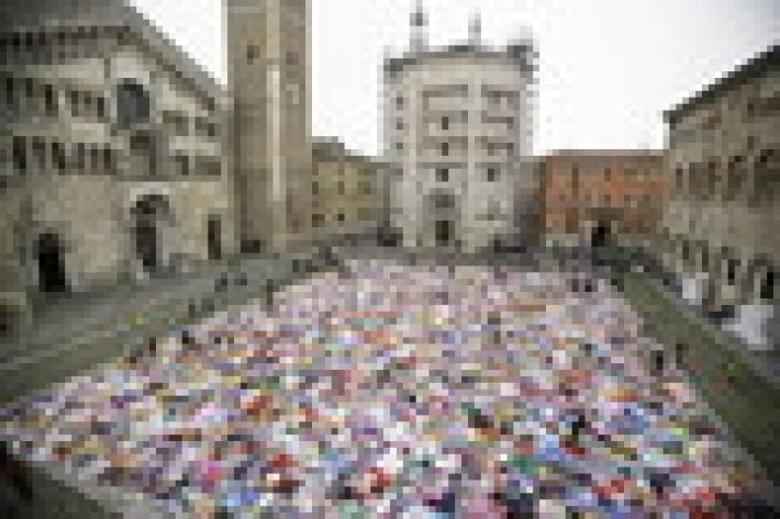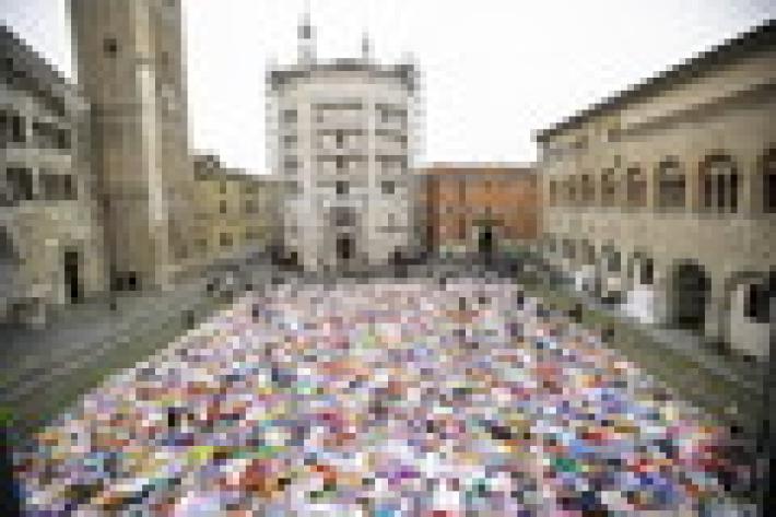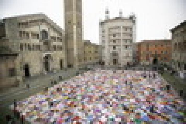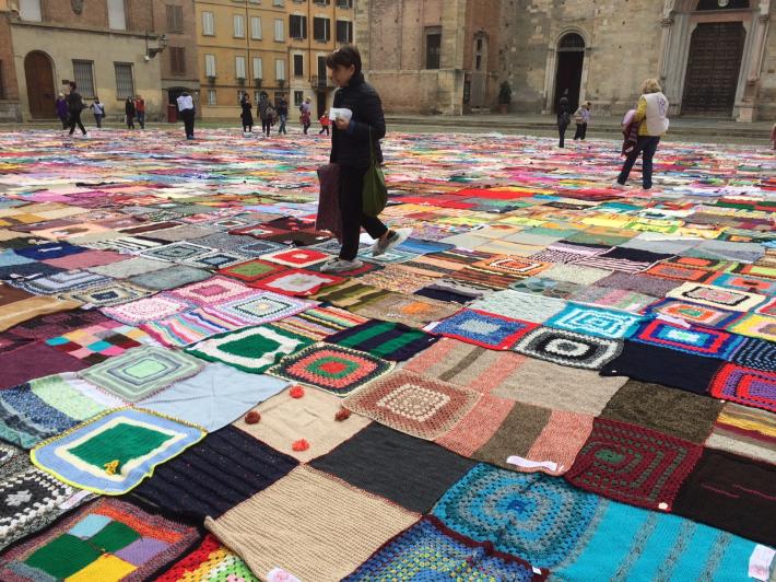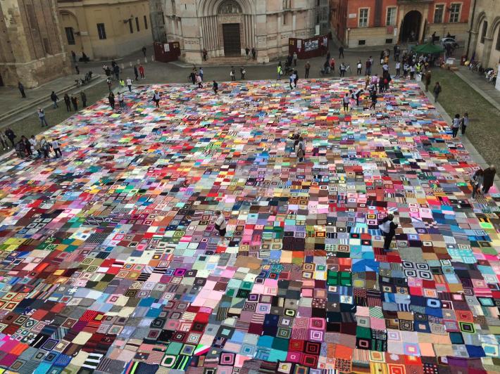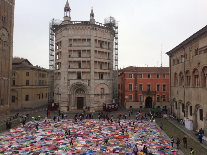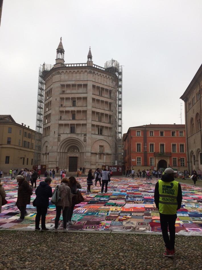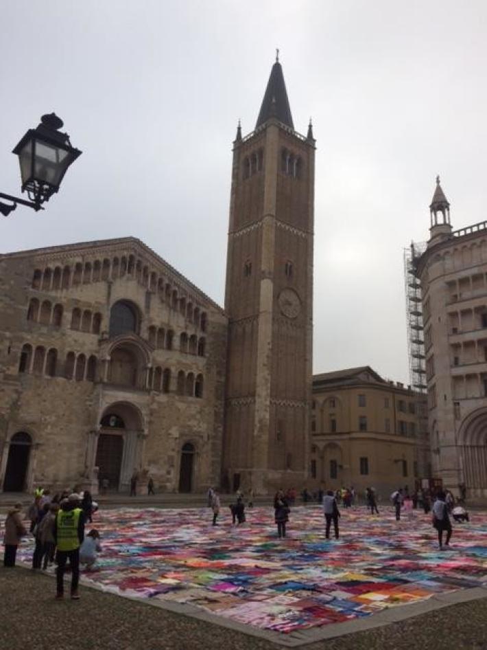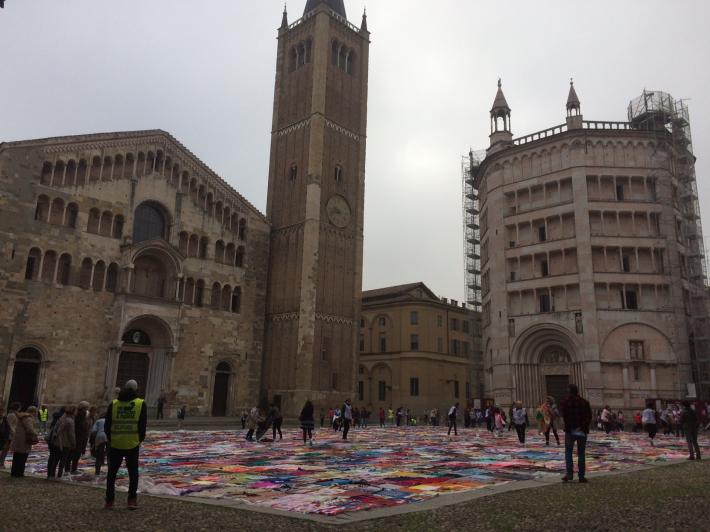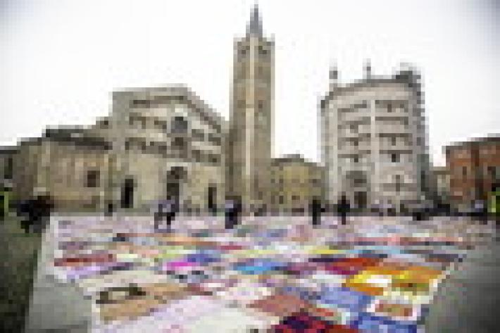 Il caldo della lana e quello dei colori: si è risvegliata così piazza Duomo, questa mattina. Con una coperta buona fatta di migliaia di quadrotti di lana realizzati da tantissimi volontari e cuciti a quattro col filo rosso. La sfida di questa opera condivisa è stata promossa da Viva Vittoria in diverse città italiane ed è arrivata a Parma grazie a La Doppia Elica. L'associazione è nata un anno fa per sensibilizzare e supportare la prevenzione e le pazienti e i pazienti a rischio di mutazione genetica Brca, ossia quelli a rischio di sviluppare tumori alle ovaie e al seno.